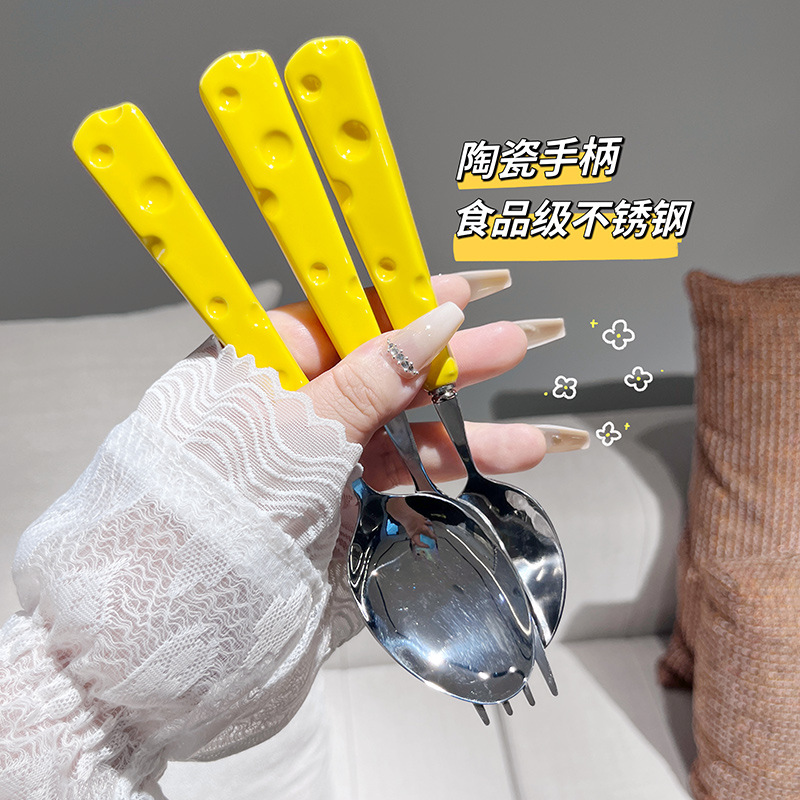 黄色奶酪不锈钢勺叉陶瓷手柄可爱家用西餐具主餐勺牛排刀叉甜品勺