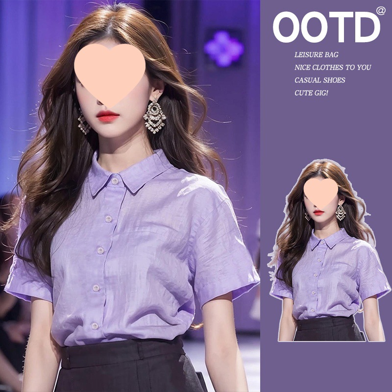 夏季新款别致polo领绝美上衣设计感多巴胺紫色短袖衬衫女