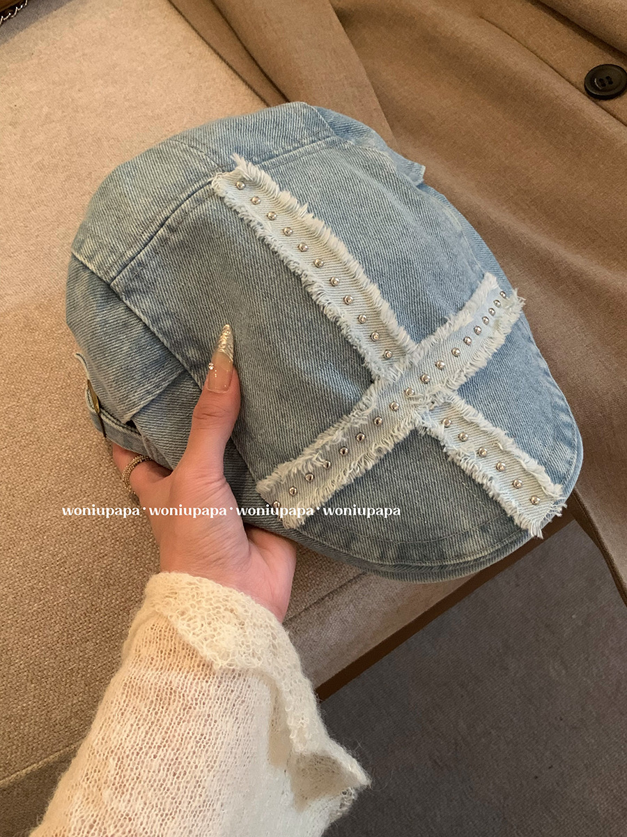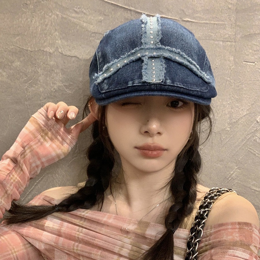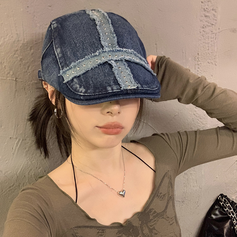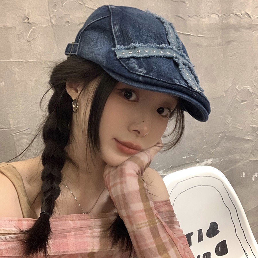 日系复古小众设计牛仔前进帽女春夏新款做旧贴布短檐鸭舌贝雷帽子