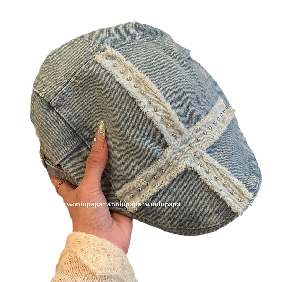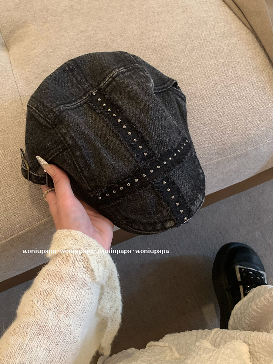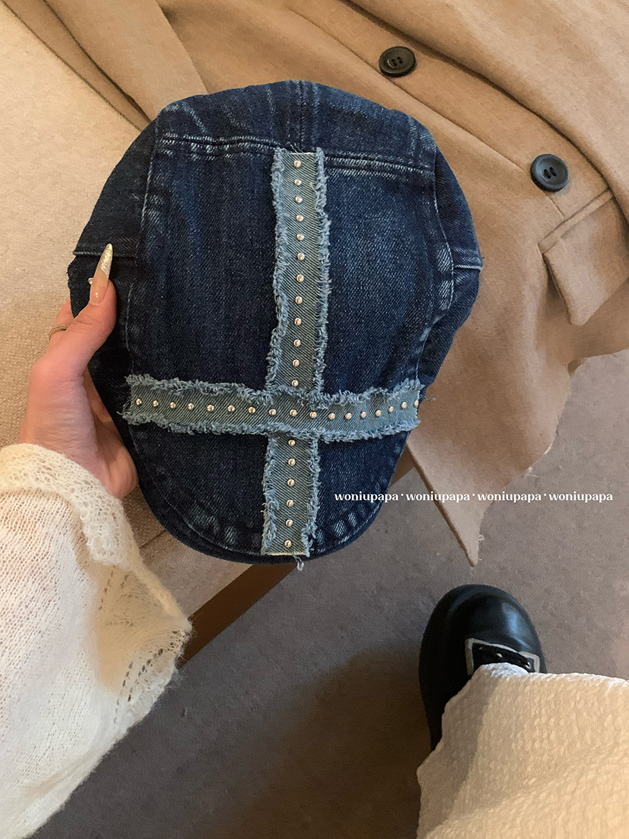 日系复古小众设计牛仔前进帽女春夏新款做旧贴布短檐鸭舌贝雷帽子