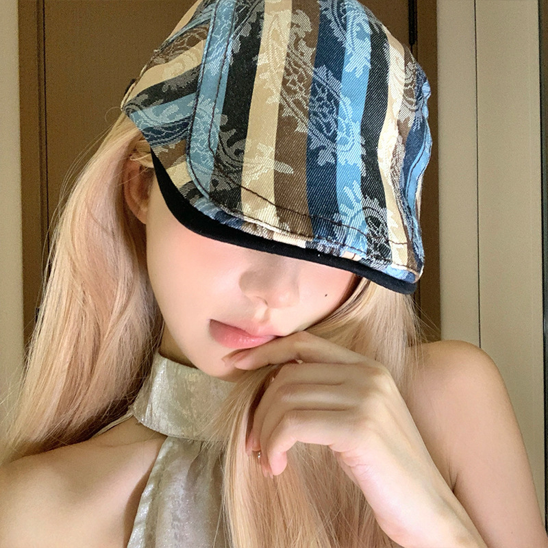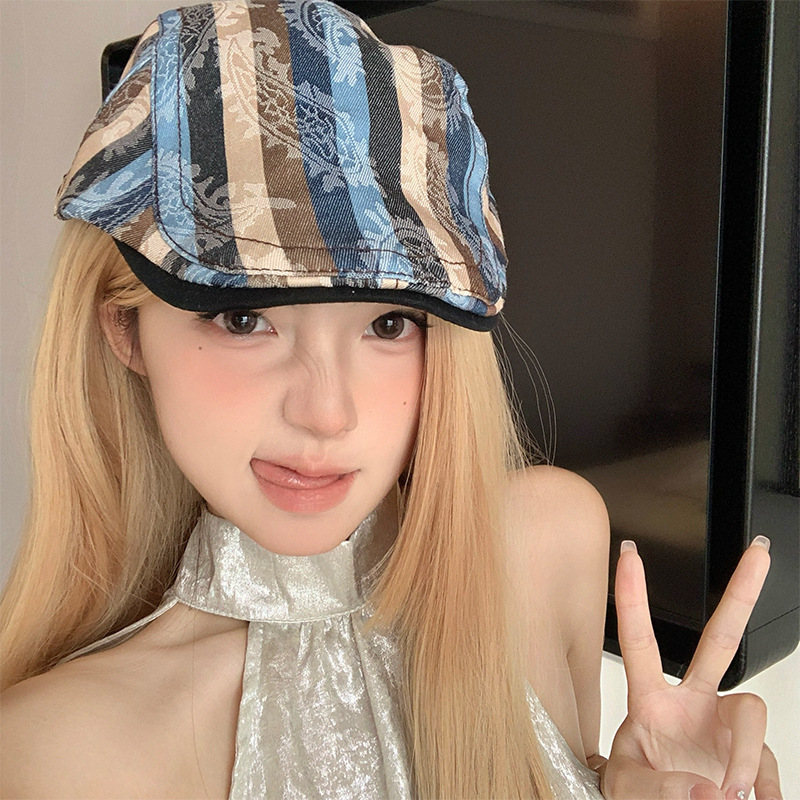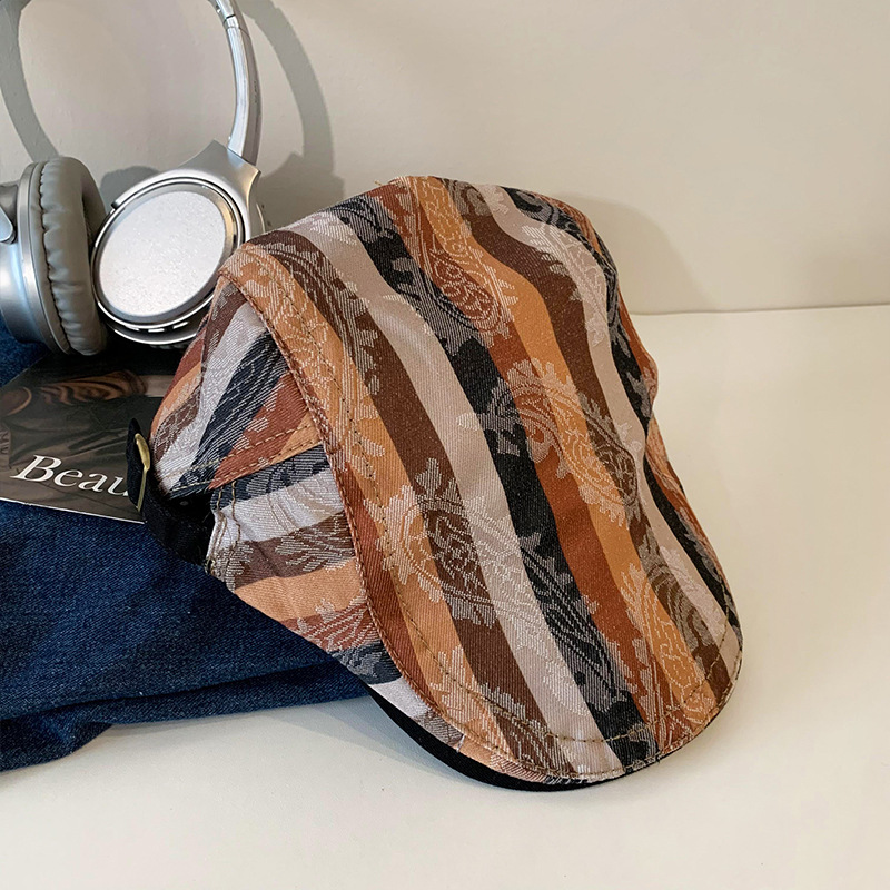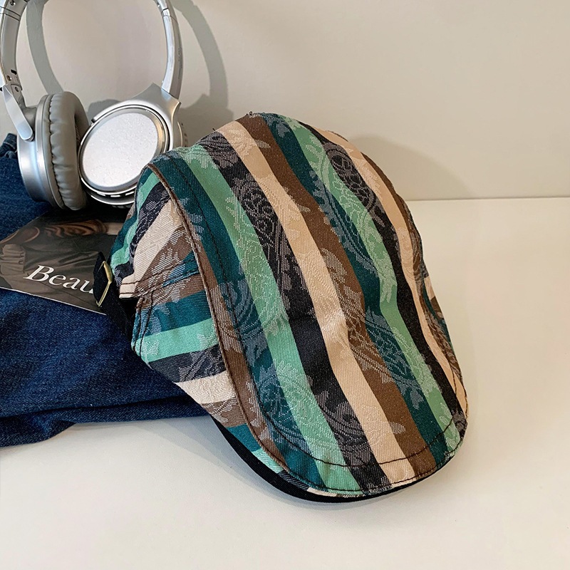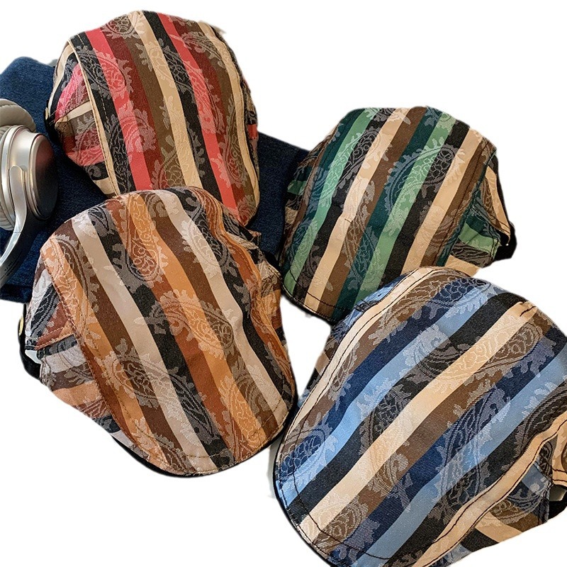 复古腰果花反戴小众设计条纹前进帽女夏季休闲百搭薄款贝雷帽子潮