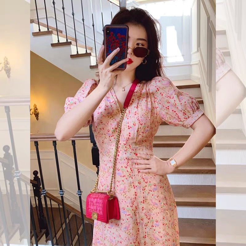 夏季新款法式复古小个子长裙女气质收腰v领粉色碎花连衣裙女