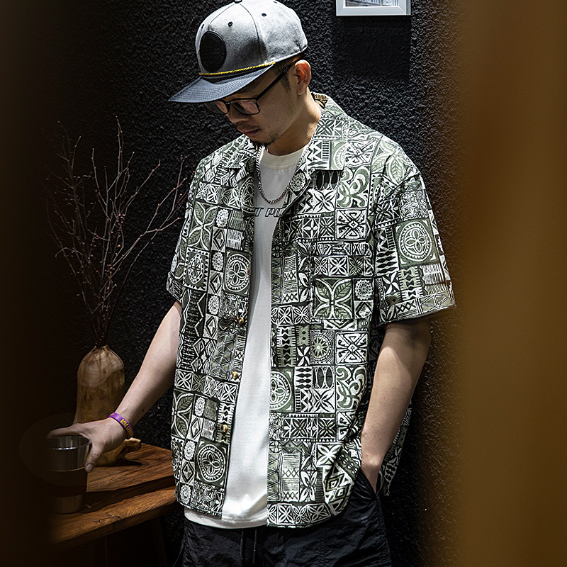 美式复古夏威夷衬衫短袖男宽松潮牌大码五分袖沙滩度假印花衬衣夏