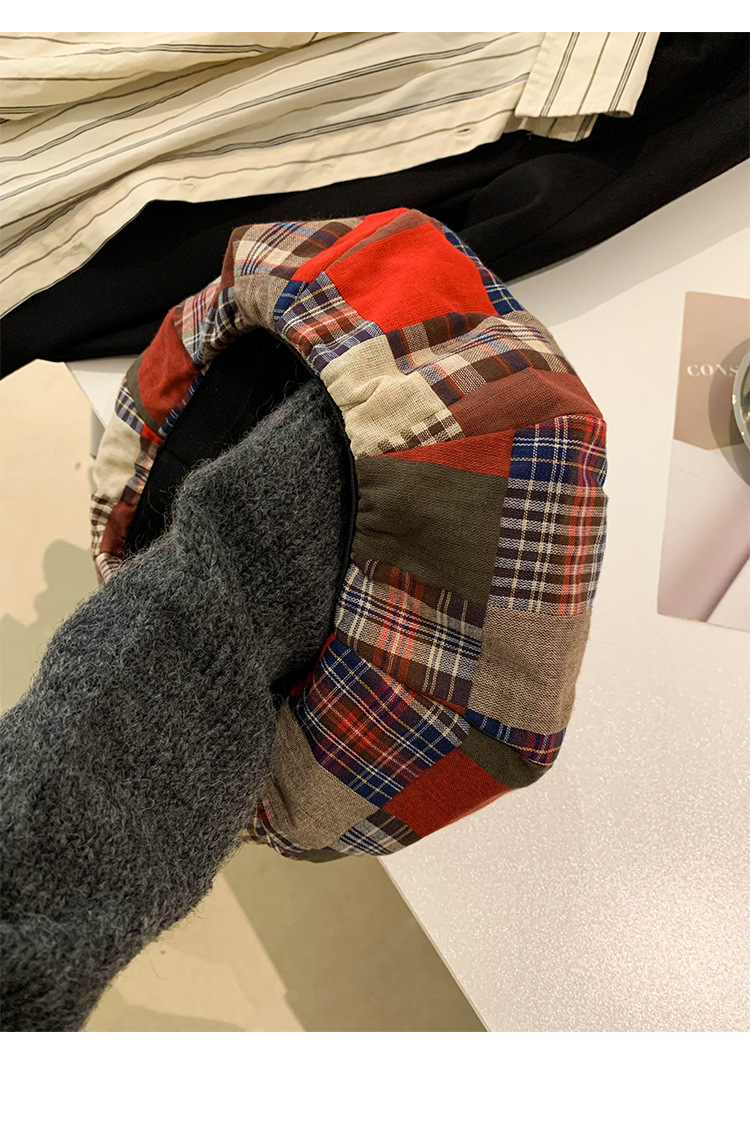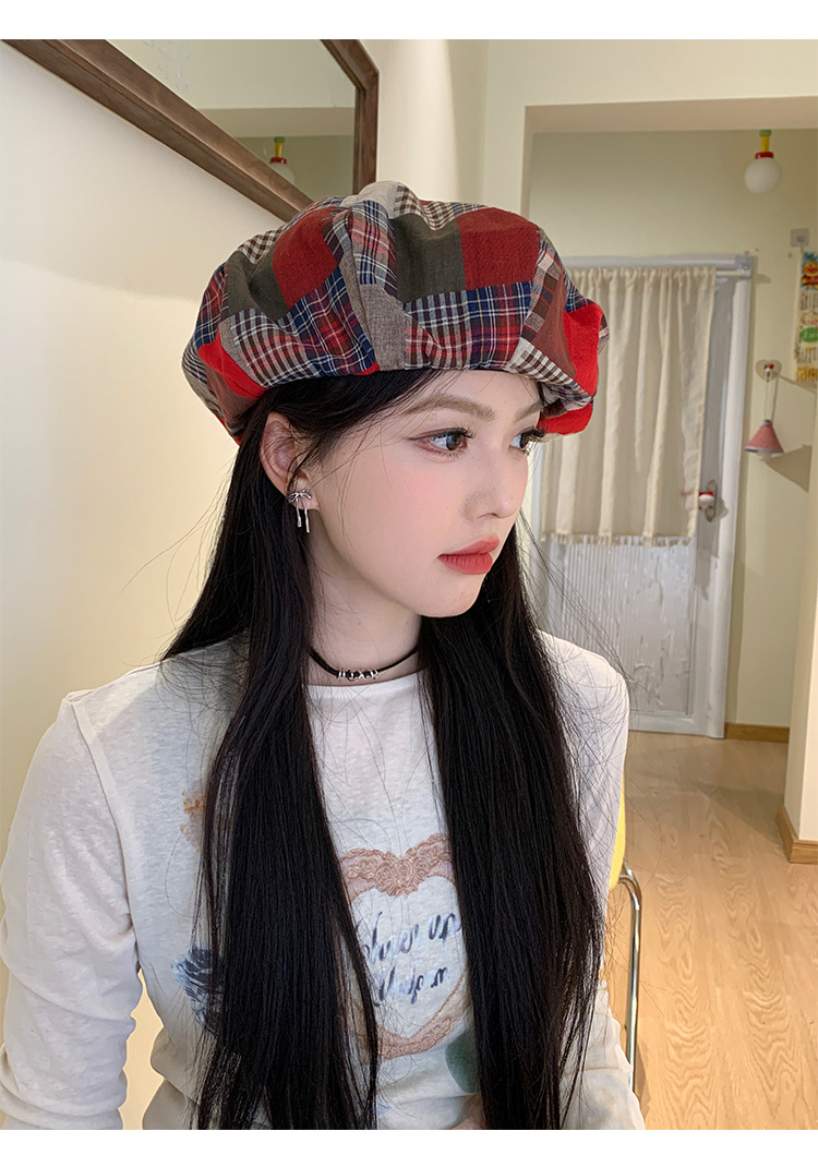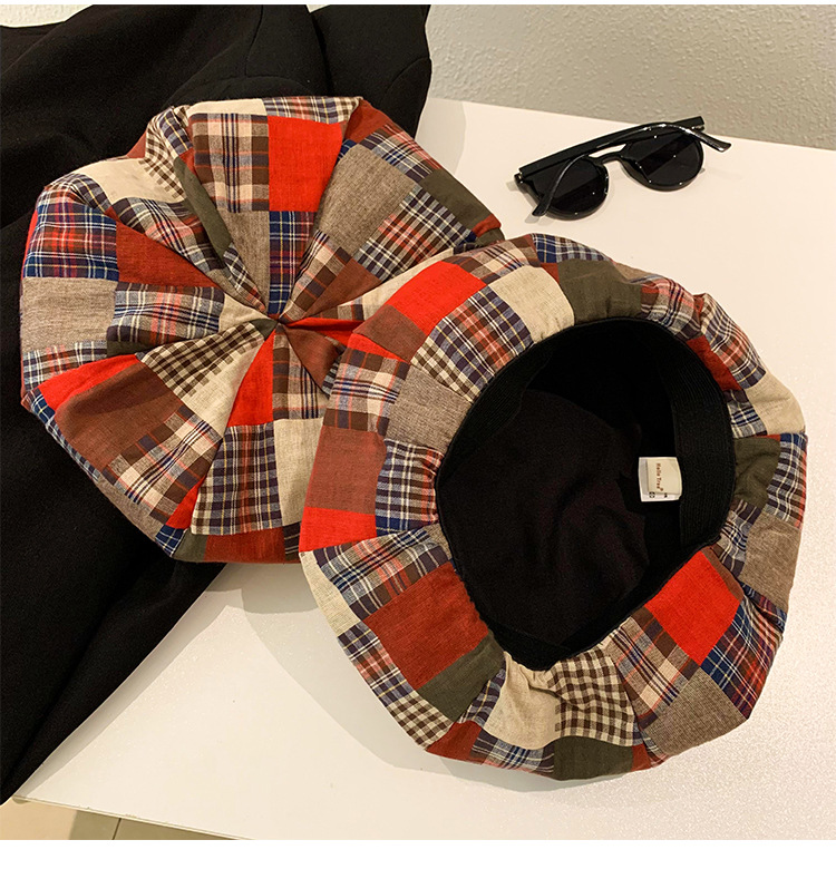 日系复古做旧拼接红色格子云朵贝雷帽女夏季薄款百搭小众八角帽子