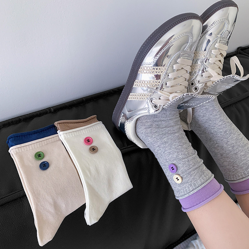 双层卷边罗口拼色袜子女ins潮饰品小纽扣韩国东大门jk潮袜女学生