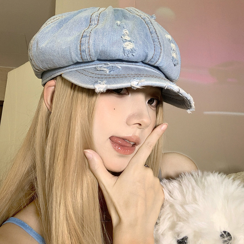 韩版夏季牛仔水洗做旧破洞贝雷帽女大头围云朵帽小众显脸小帽子潮