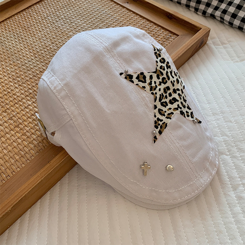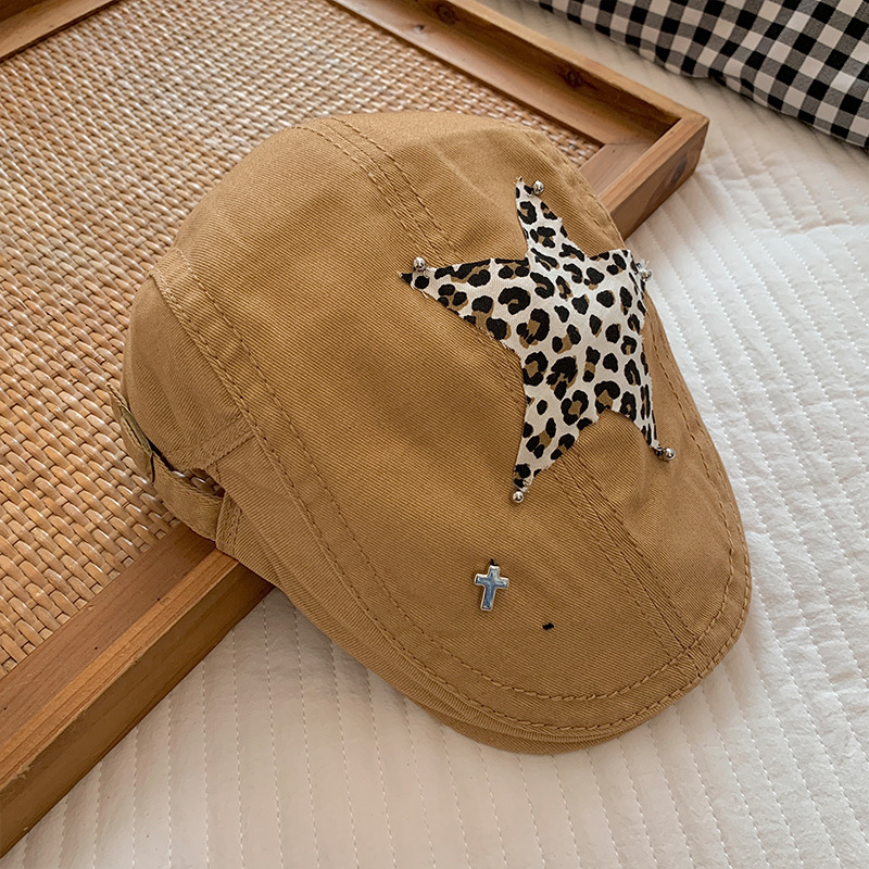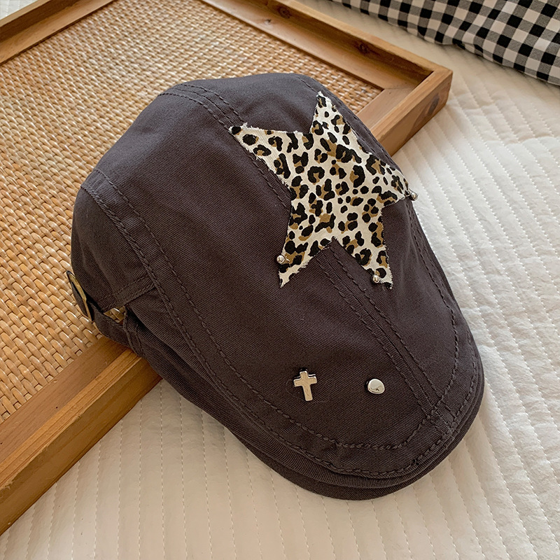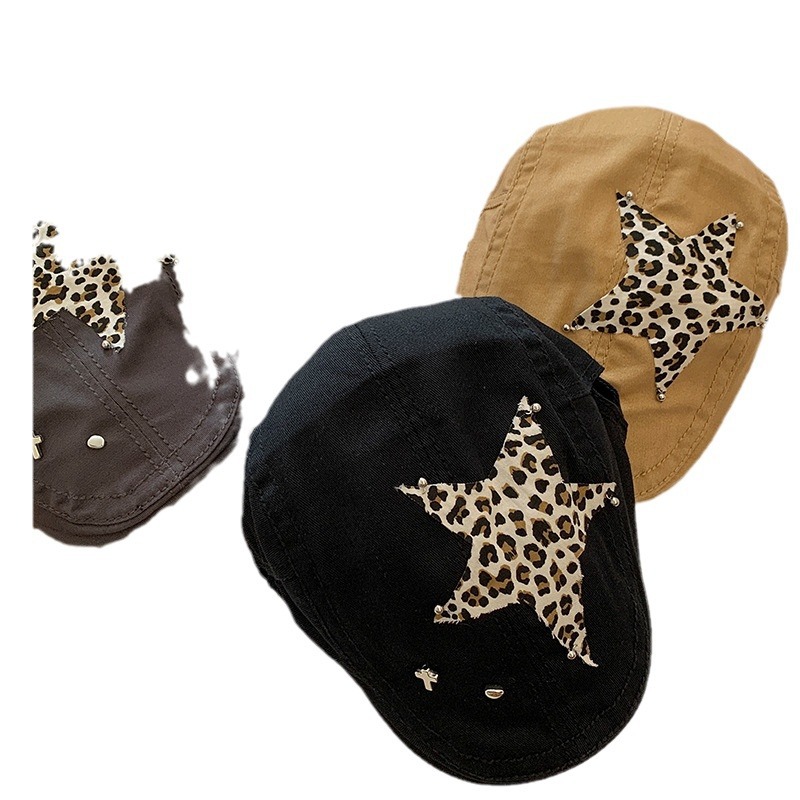美式复古星星豹纹贴布前进帽女小众大头围黑色贝雷帽显脸小帽子潮