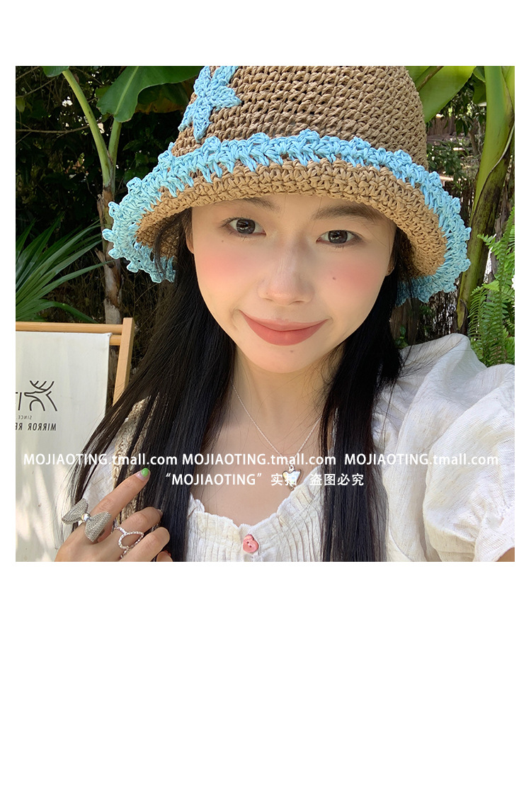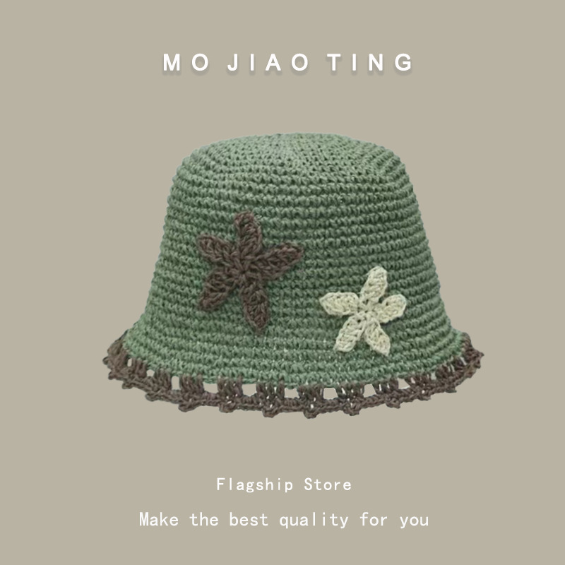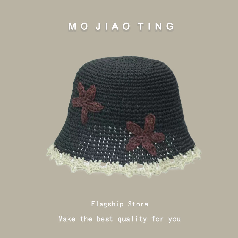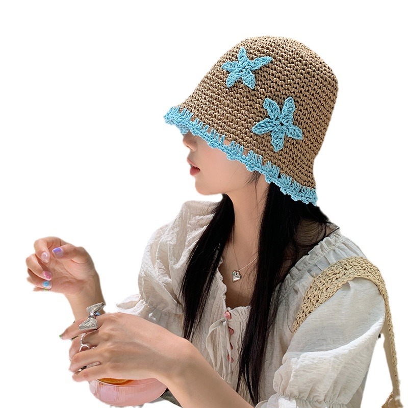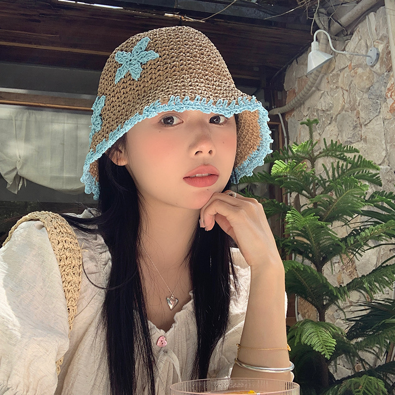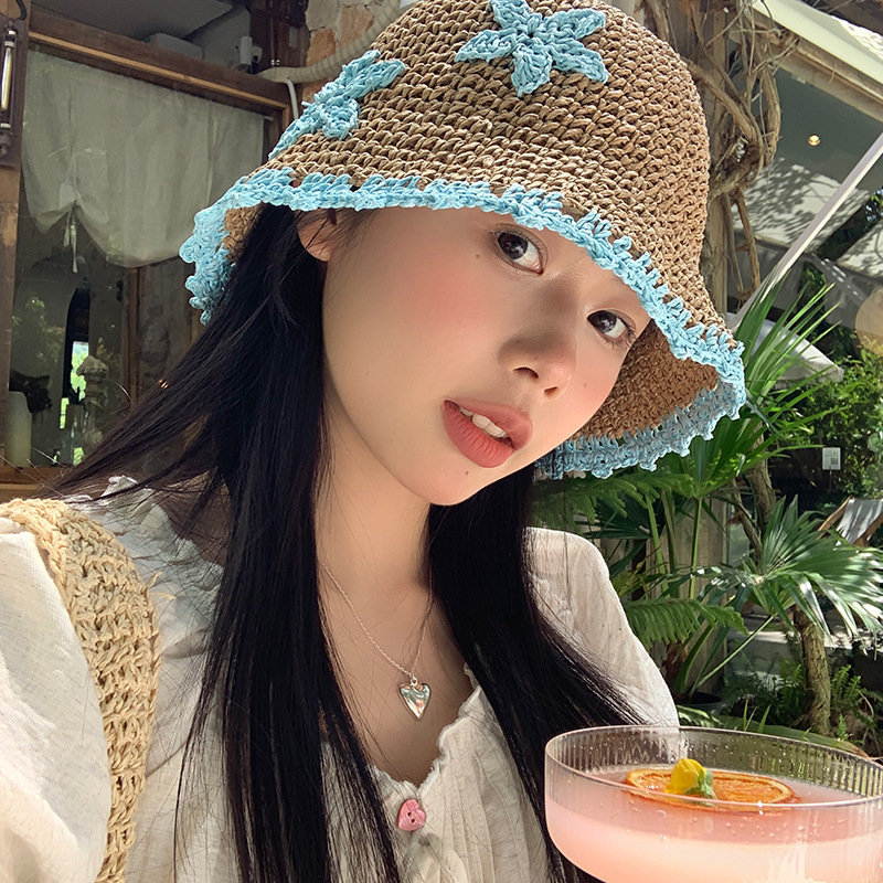 夏季撞色花朵草编渔夫帽女遮阳防晒水桶帽日系小清新显脸小草帽子