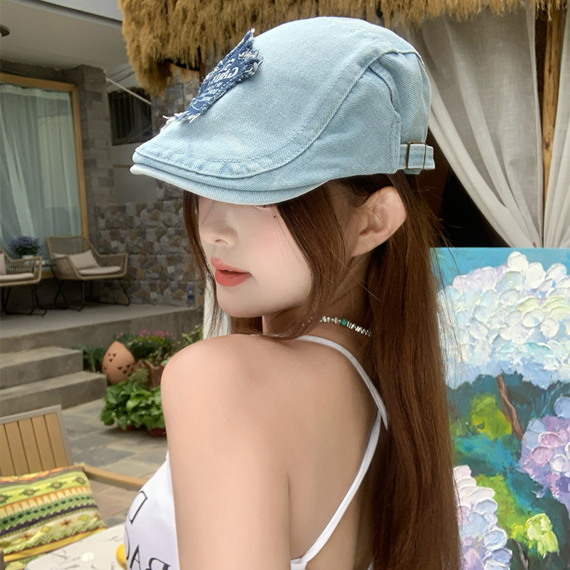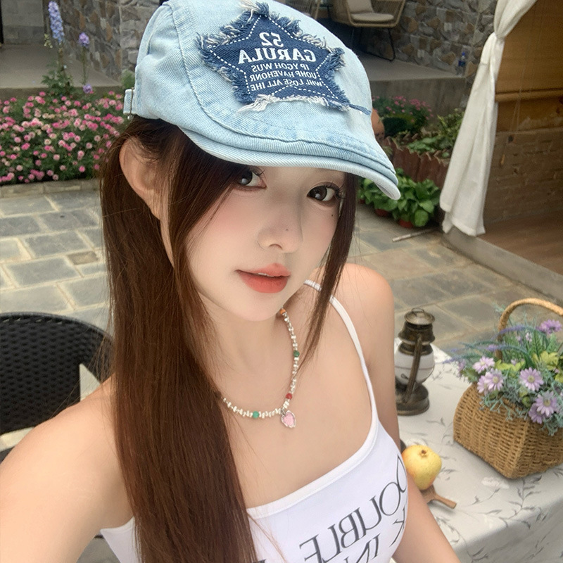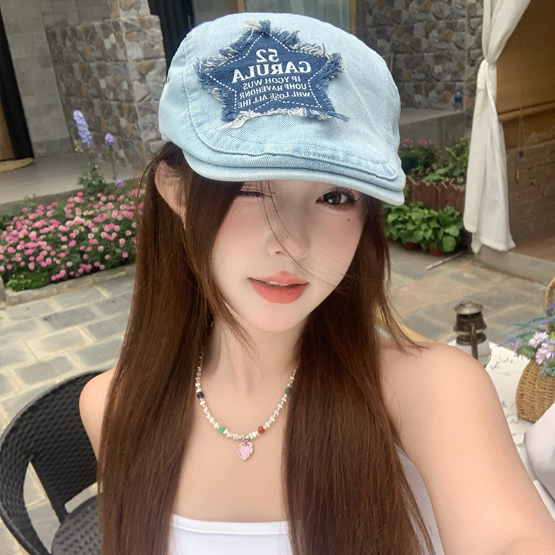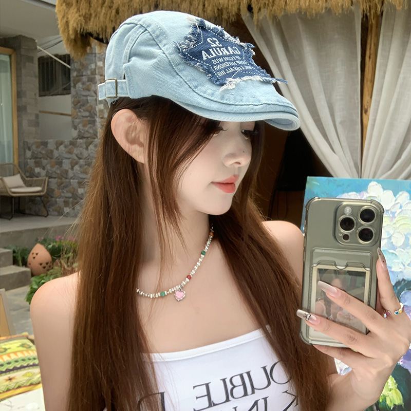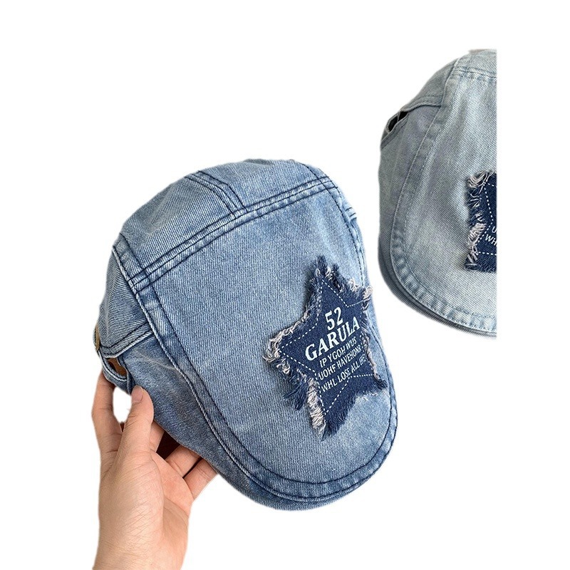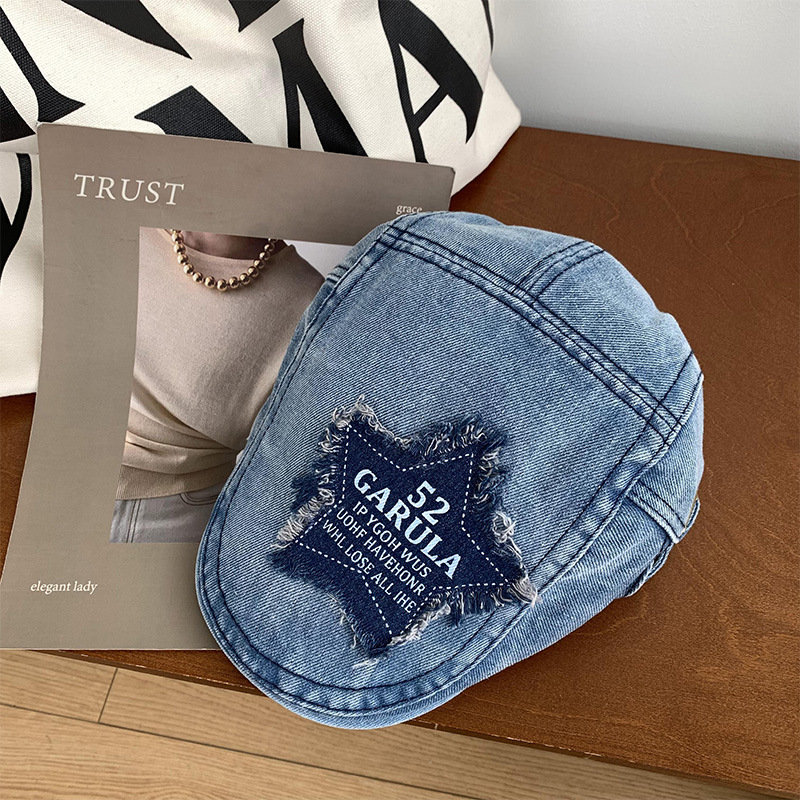夏季新款字母星星贴片复古牛仔前进帽女大头围可调节鸭舌贝雷帽子