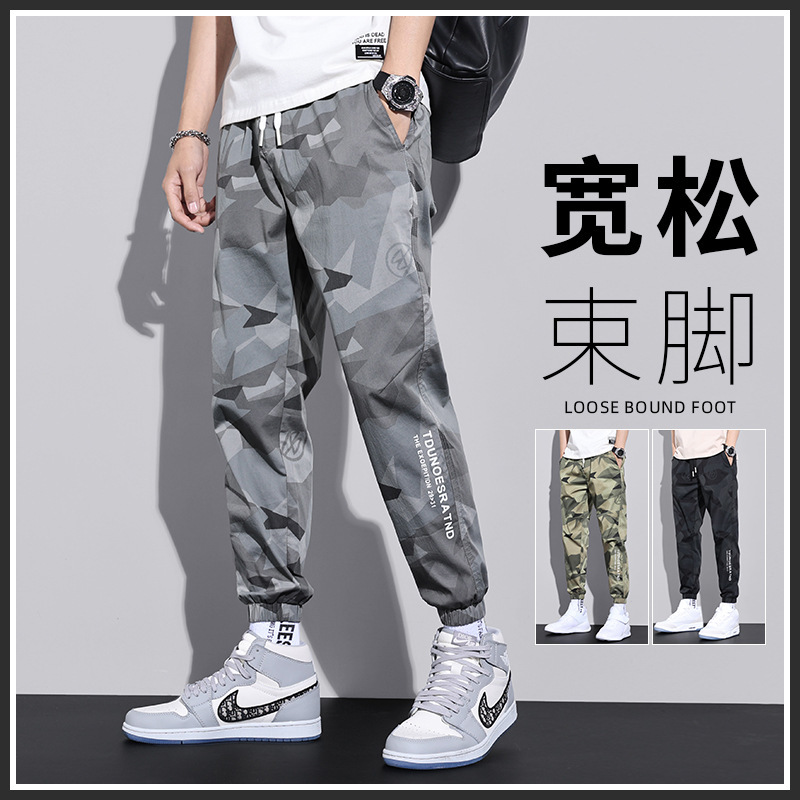 休闲裤子男士夏季薄款运动九分裤哈伦冰丝迷彩宽松束脚工装裤潮牌
