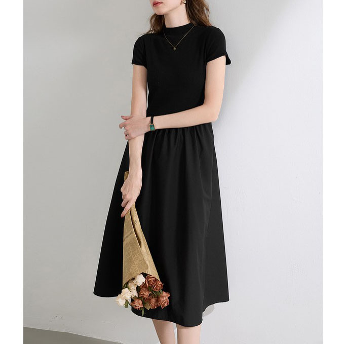 2025春夏季新款拼接连衣裙优雅半高领收腰A字裙正肩长裙女