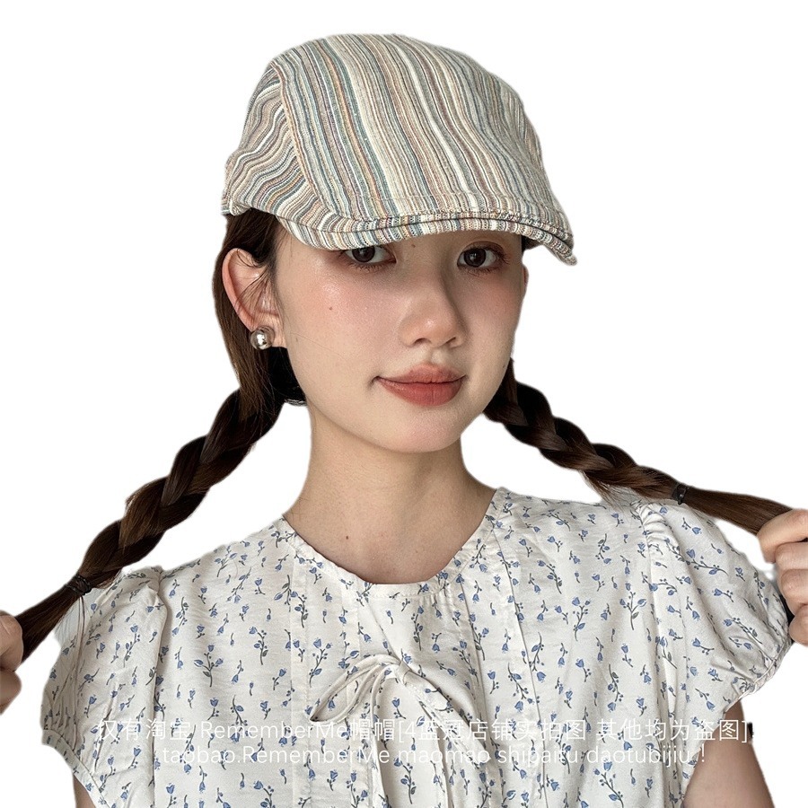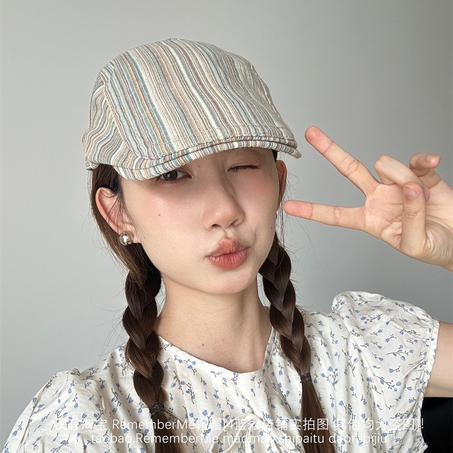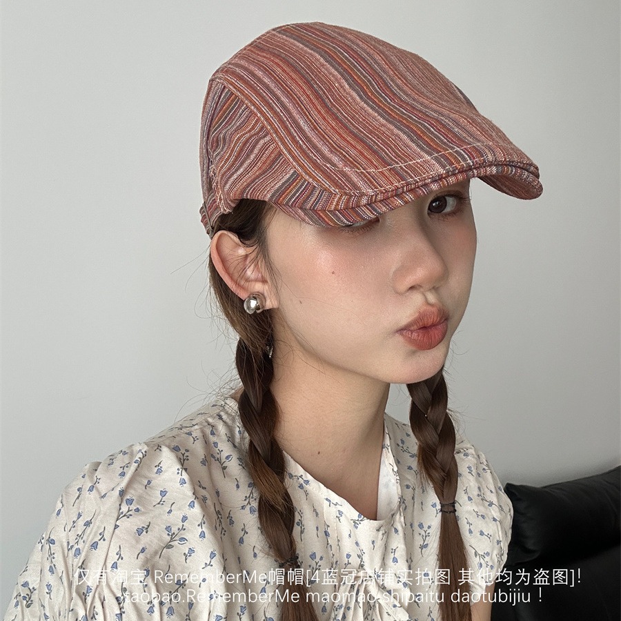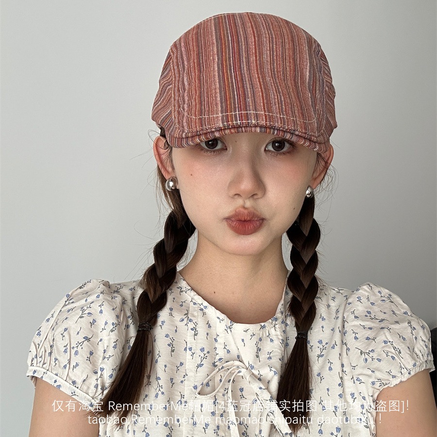 显脸小撞色条纹前进帽小众百搭大头围可调节夏季文艺贝雷帽画家帽