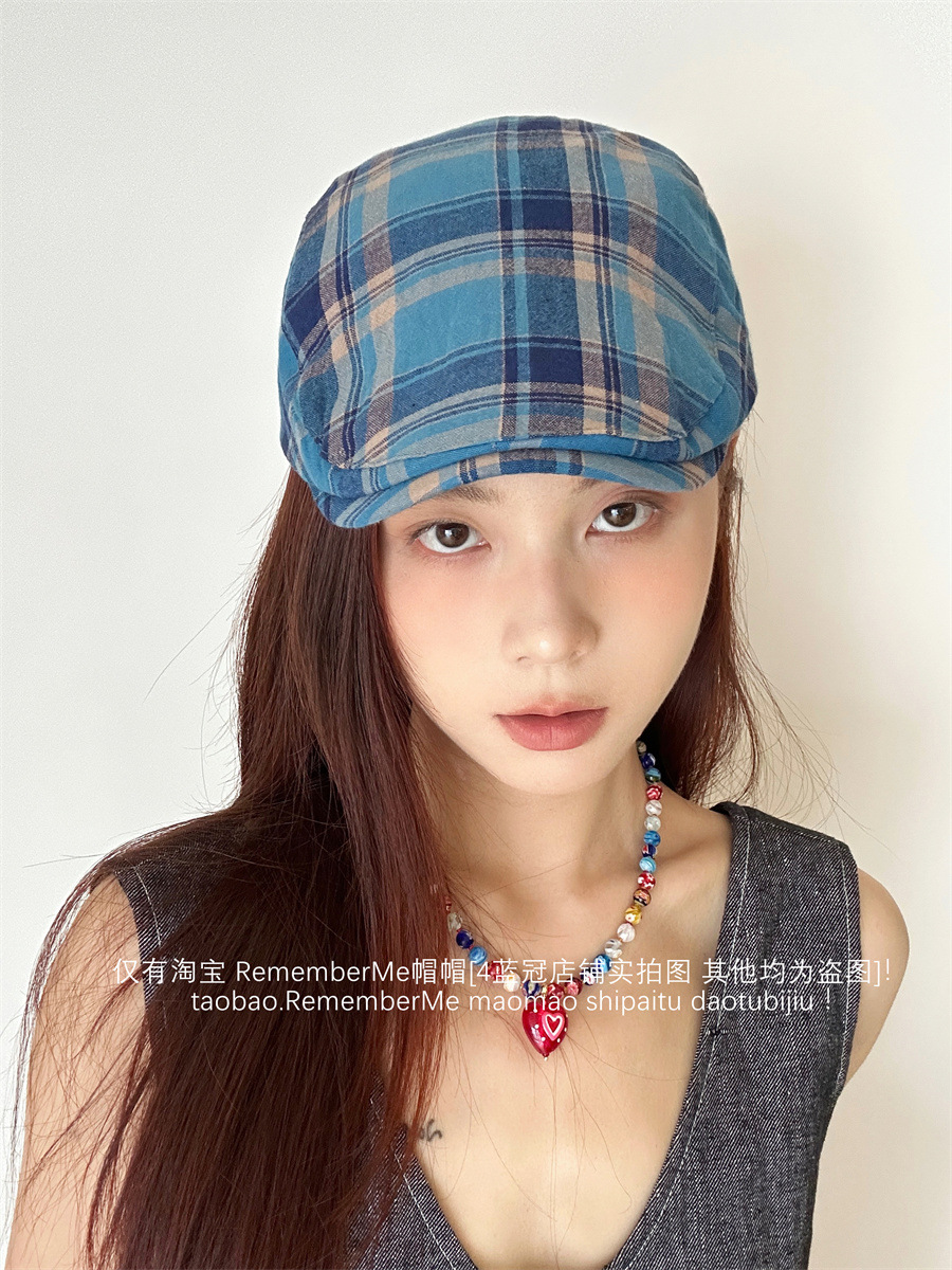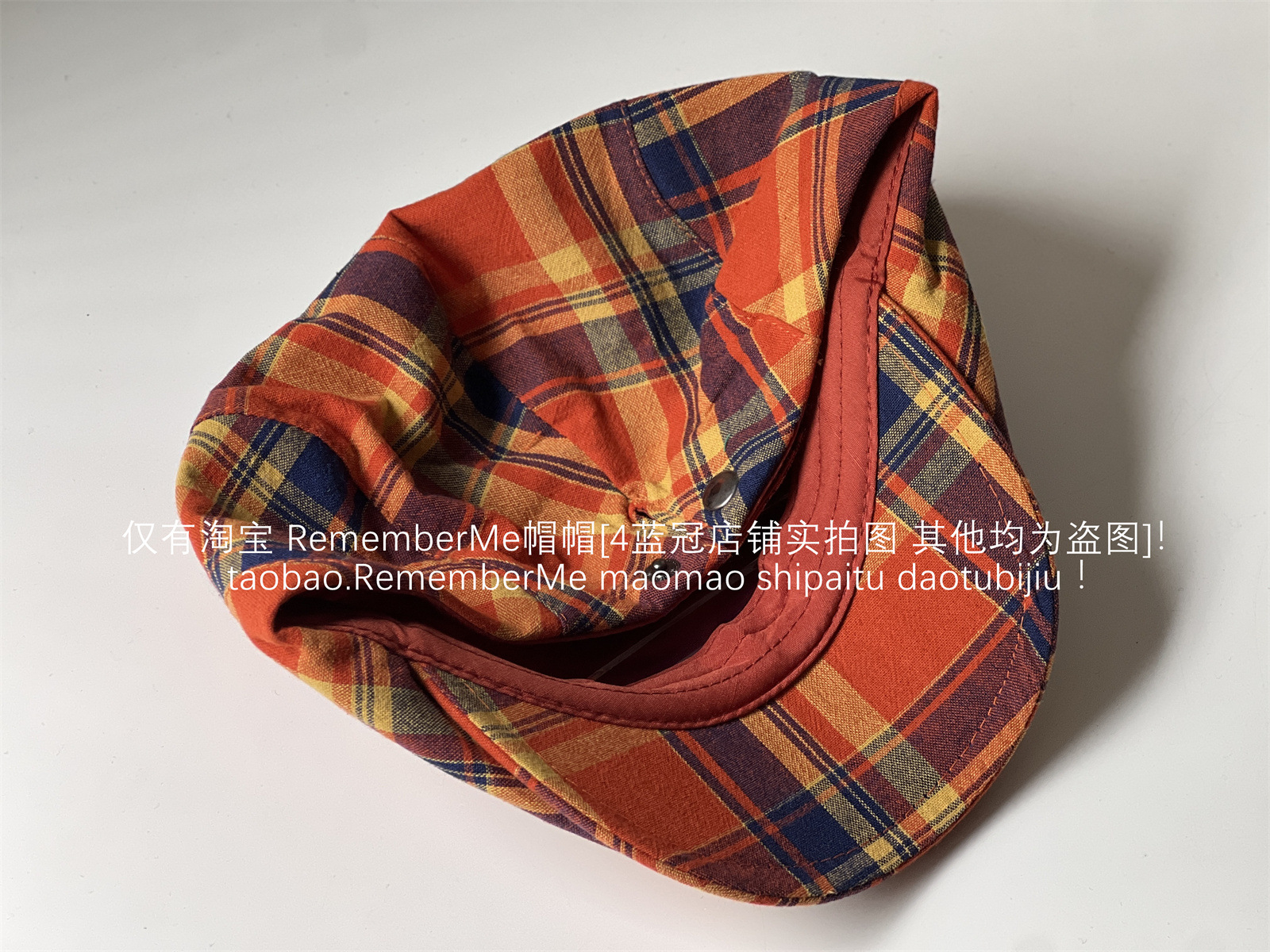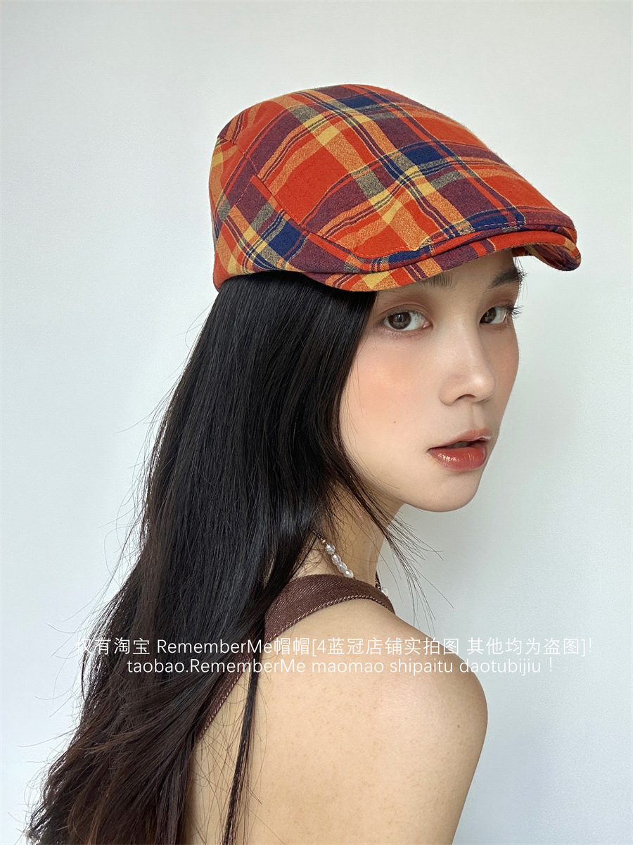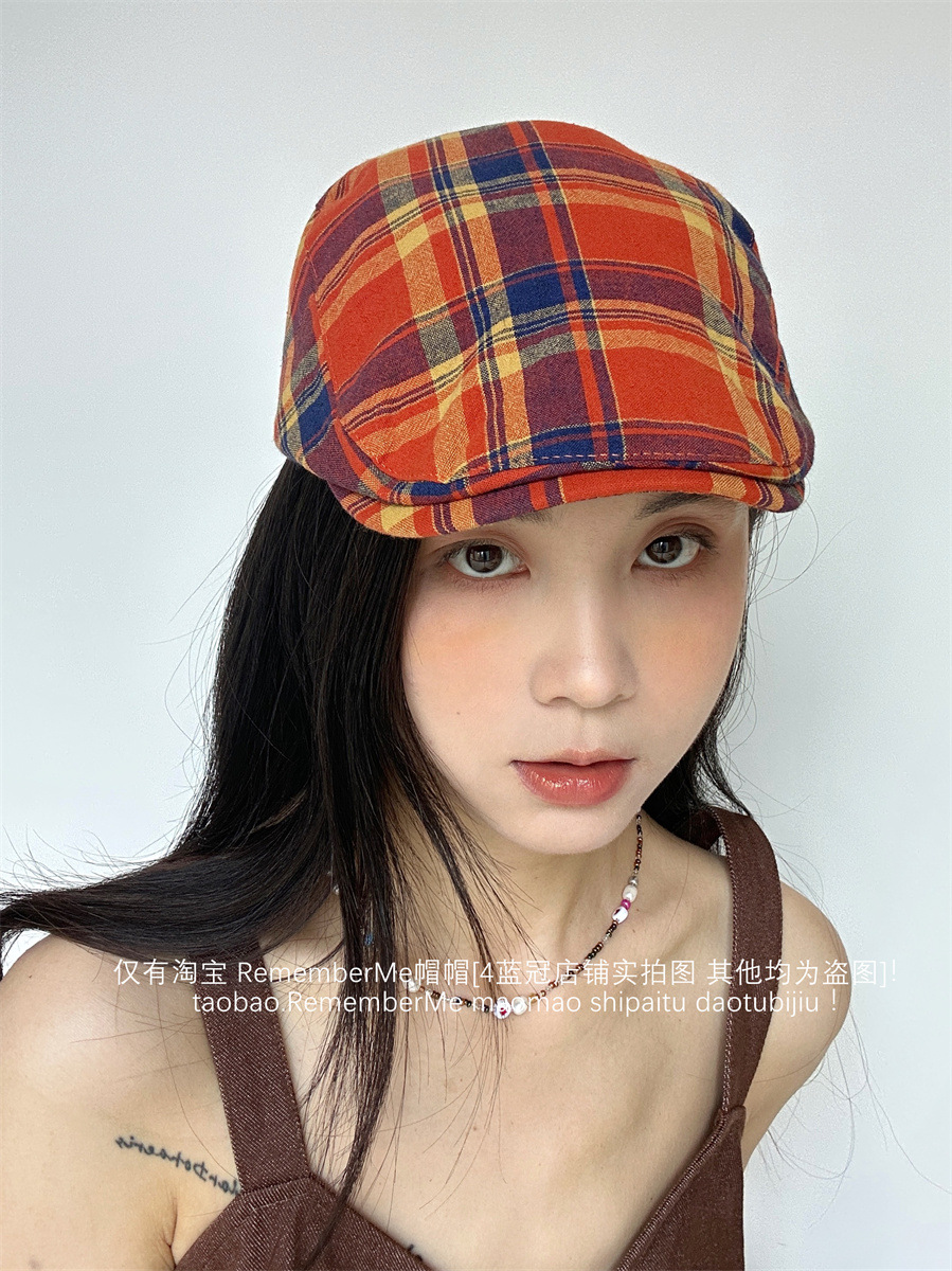 夏季薄款显白海盐蓝色格纹前进帽日系显脸小炸街橘色复古画家帽女