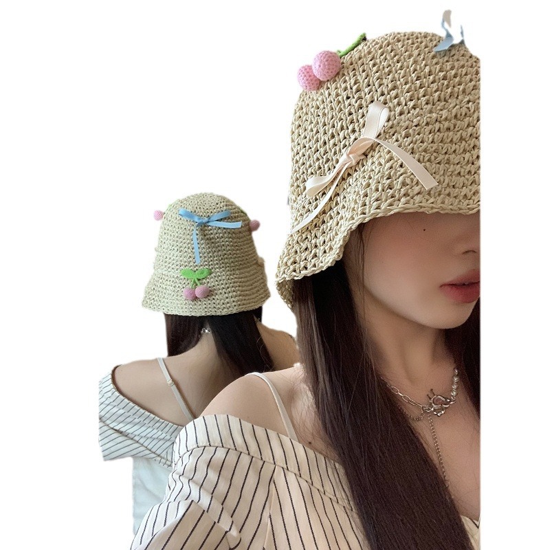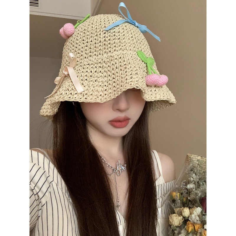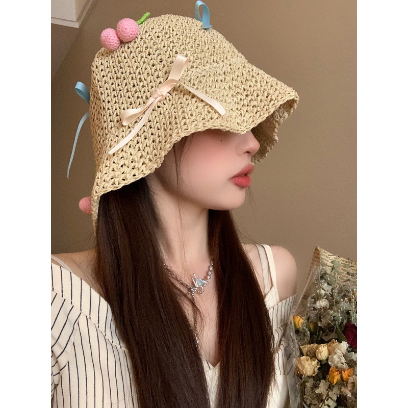 diy蝴蝶结草帽女新款拉菲草镂空透气草编帽子深顶大头围显脸小