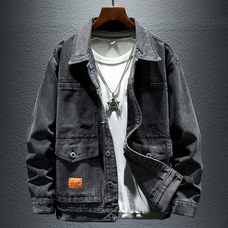 高级感黑灰色牛仔外套男春秋季宽松休闲加绒美式工装翻领夹克上衣