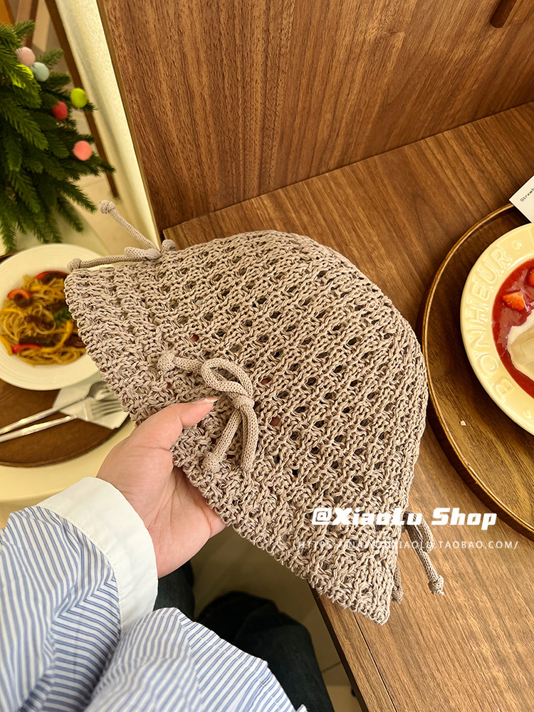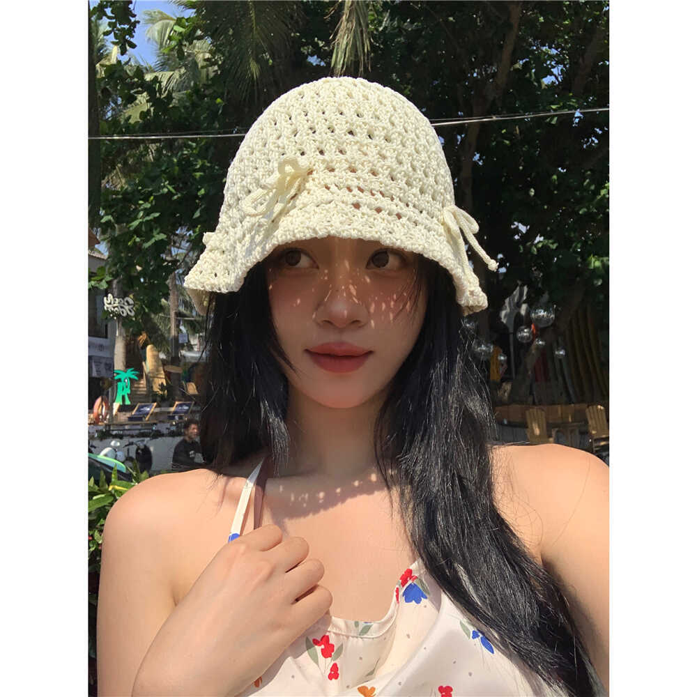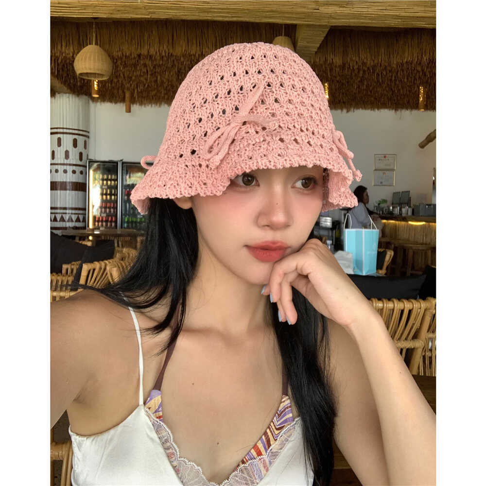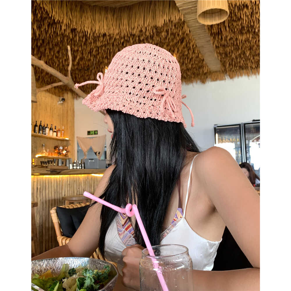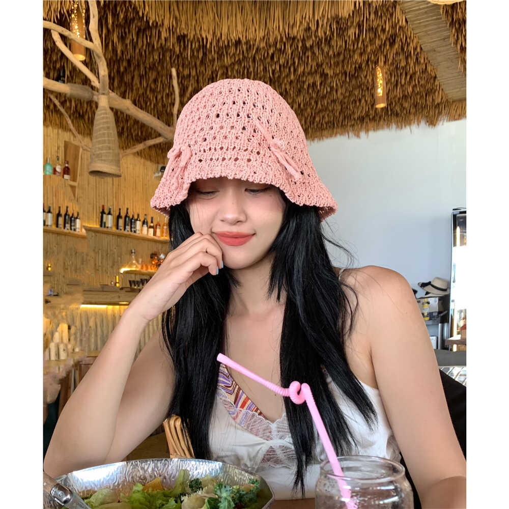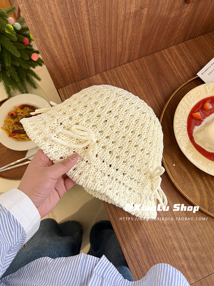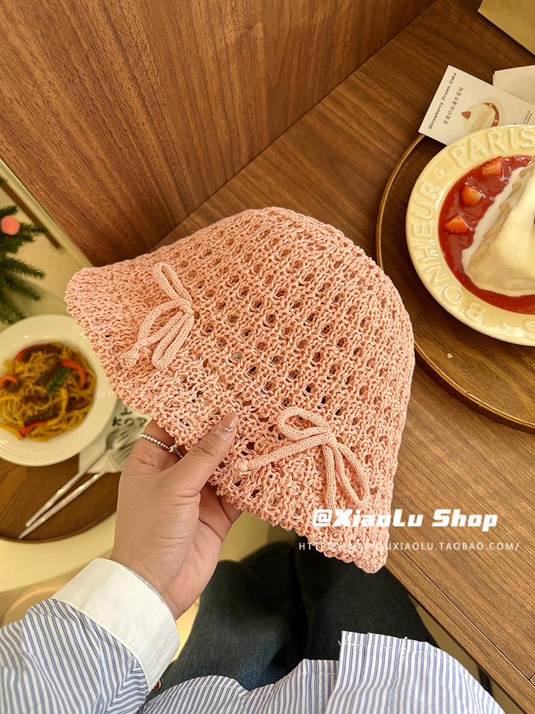 韩系甜美蝴蝶结渔夫帽子女夏季镂空ins针织网眼草编透气休闲盆帽