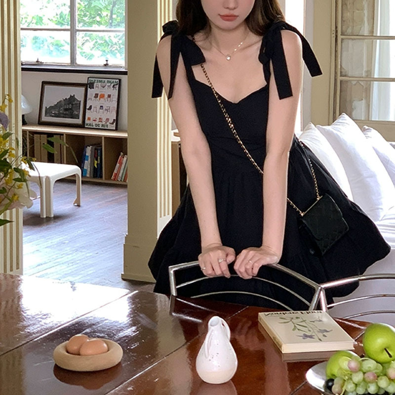小舞曲法式少女吊带无袖小黑裙连衣裙夏季赫本风系带短裙夏季裙子