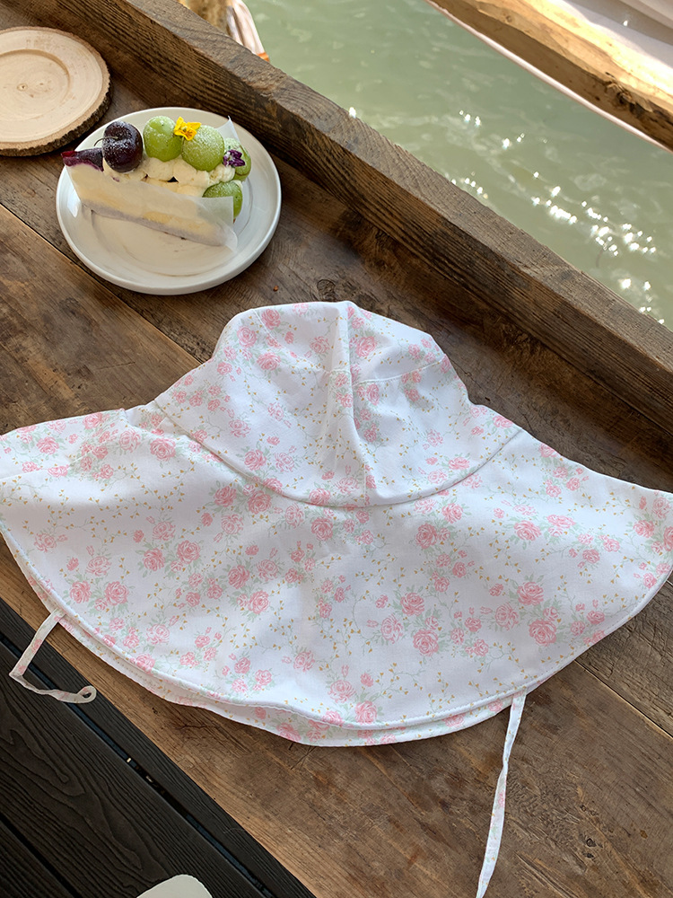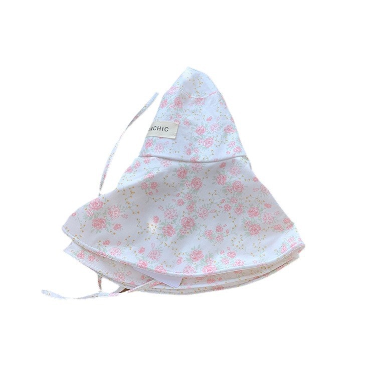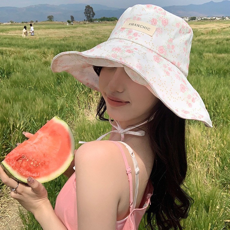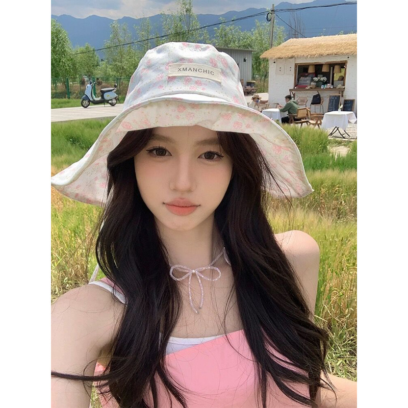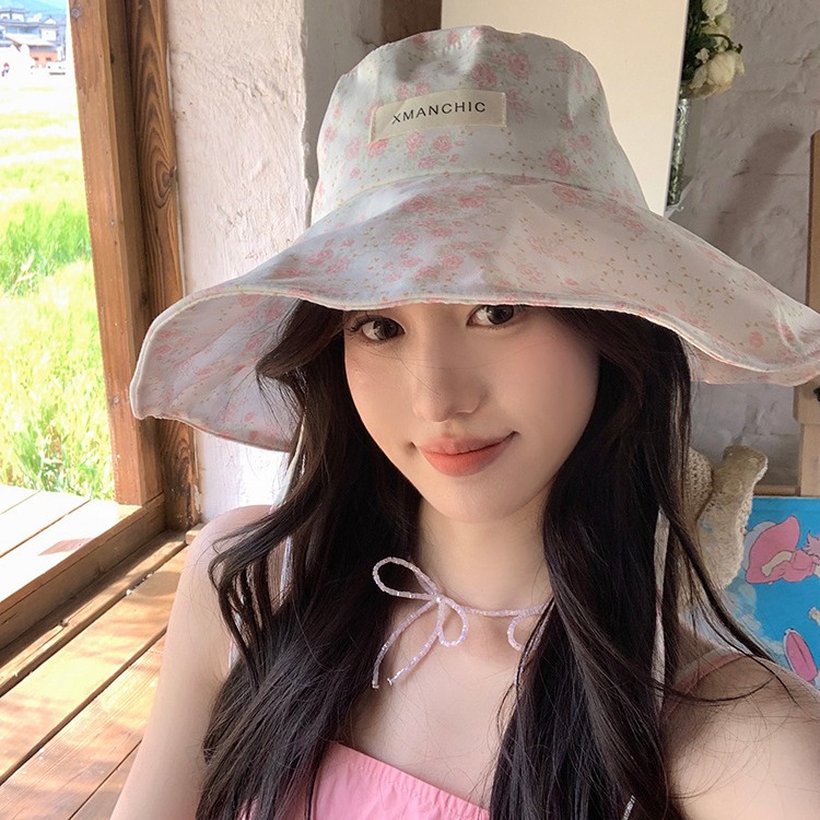 防晒帽女夏季粉色甜美小碎花荷叶边大檐渔夫帽百搭显脸小遮阳帽子