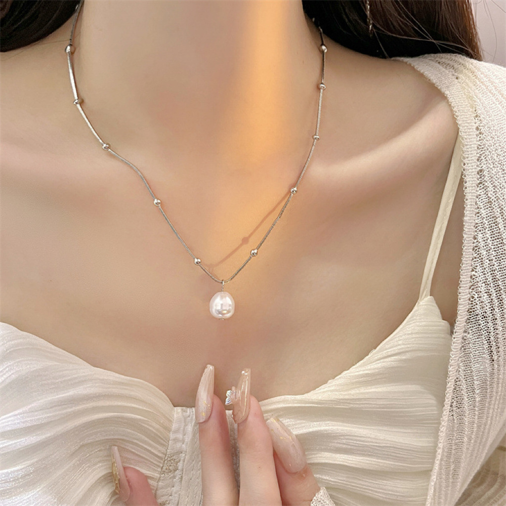 轻奢小众钛钢不掉色一颗珍珠项链饰品女百搭法式高级感蛇骨毛衣链