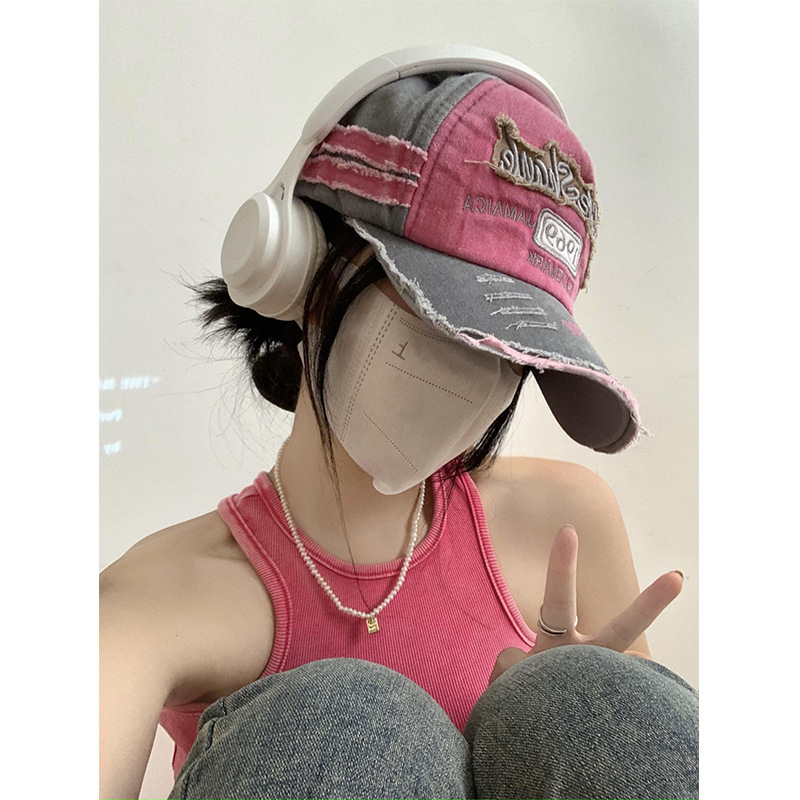 美式复古棒球帽女做旧磨边显脸小鸭舌帽韩版深顶大头围宽帽檐帽子