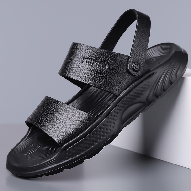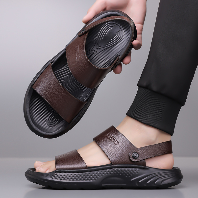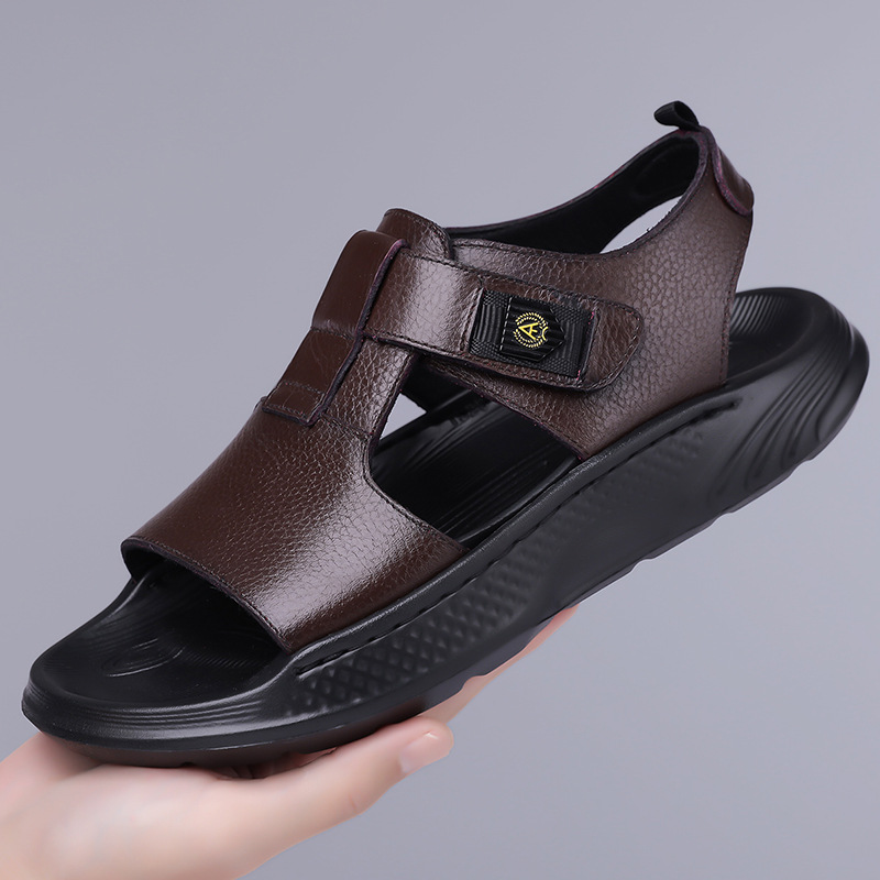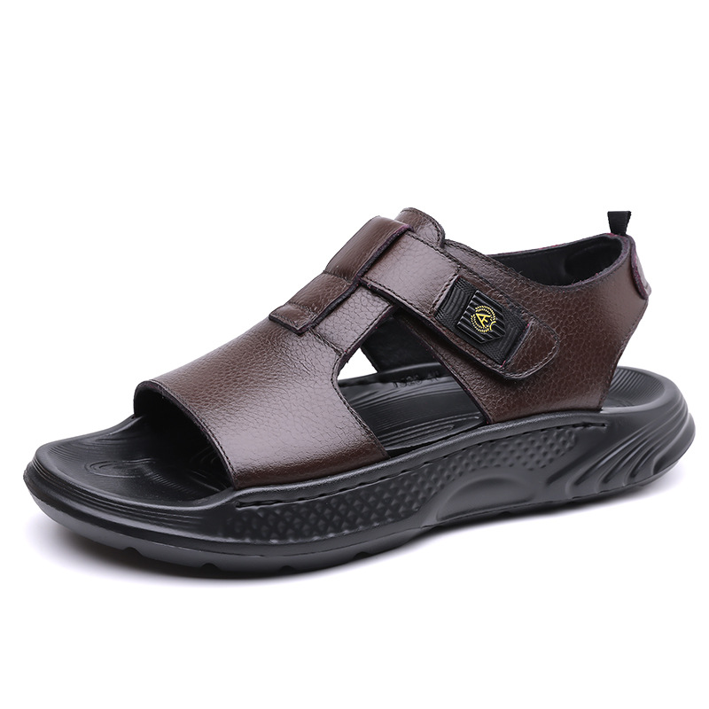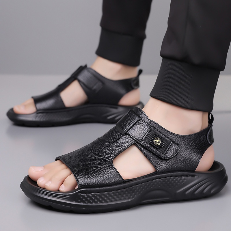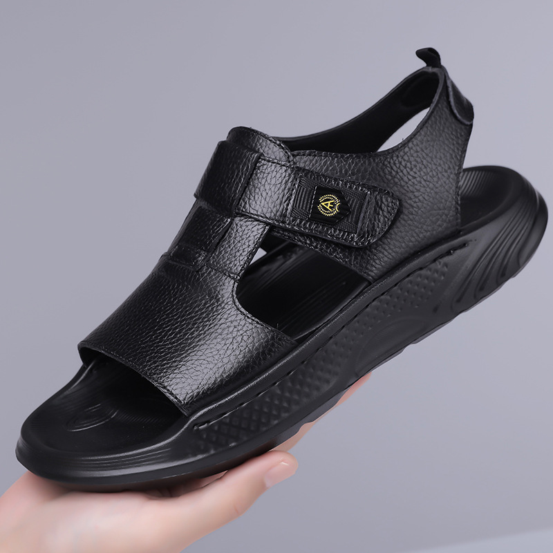 真皮沙滩鞋夏季厚底男士魔术贴凉鞋男露趾防滑
