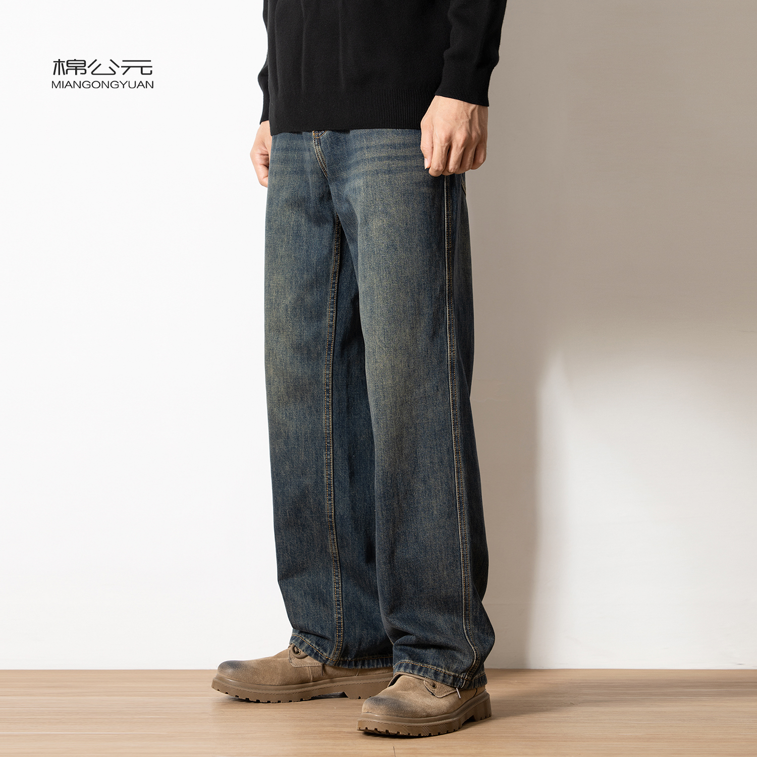 棉公元秋冬季新款直筒牛仔裤男宽松美式复古做旧大码加绒长裤