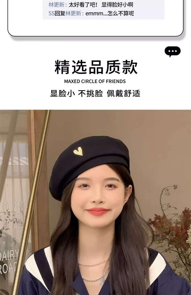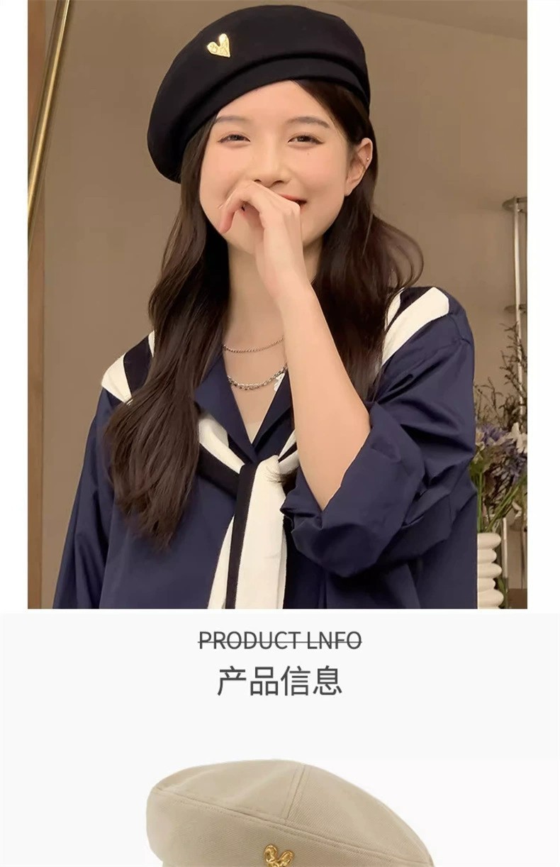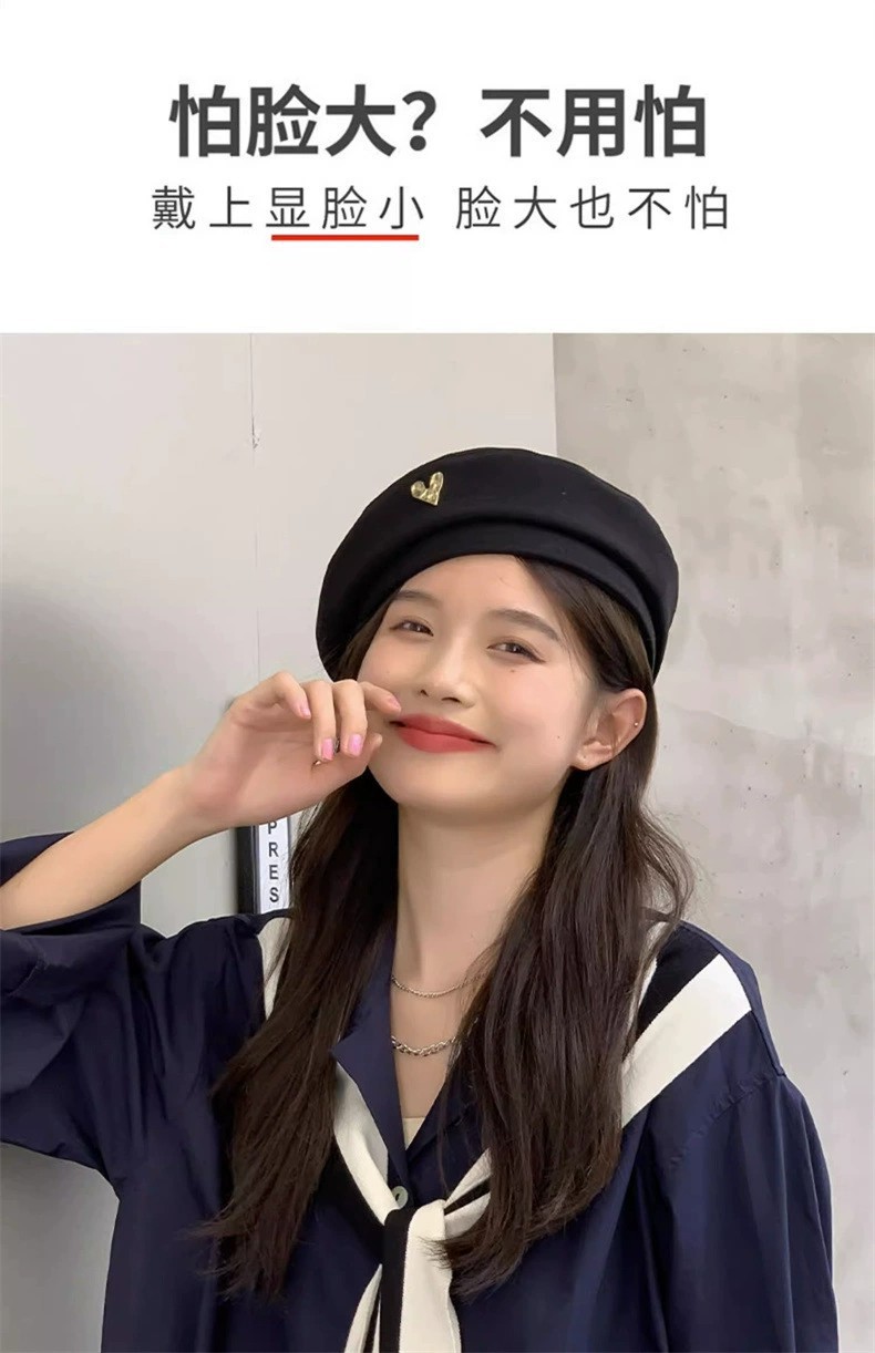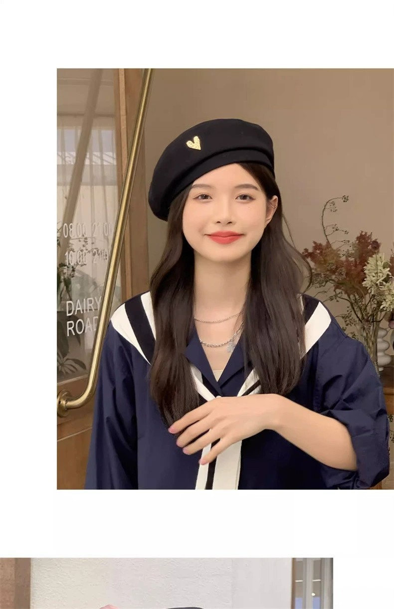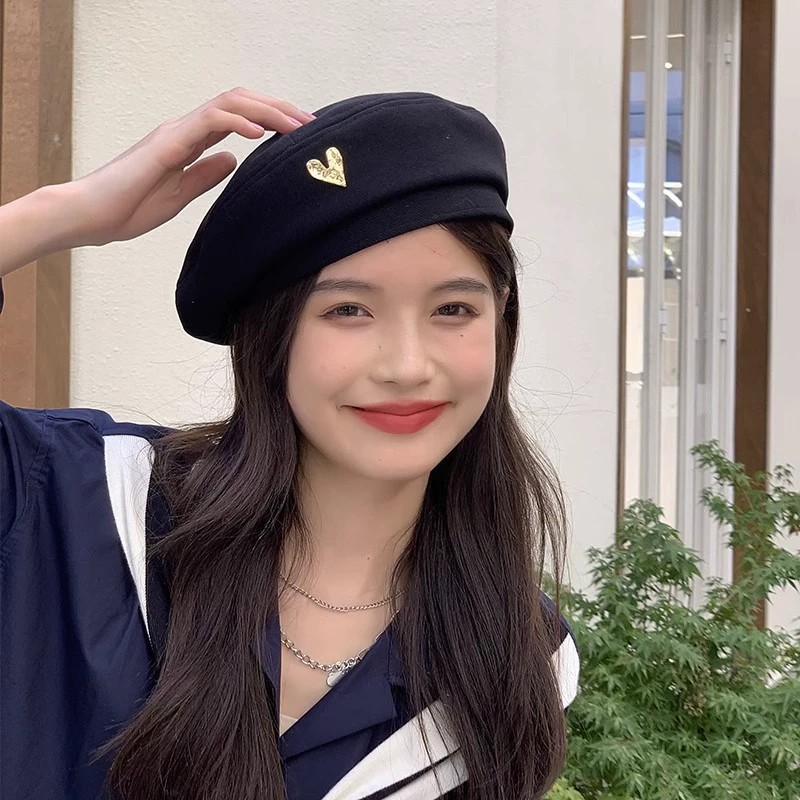 贝雷帽女秋冬爱心金属标毛呢保暖帽子ins小红书网红显脸小画家帽