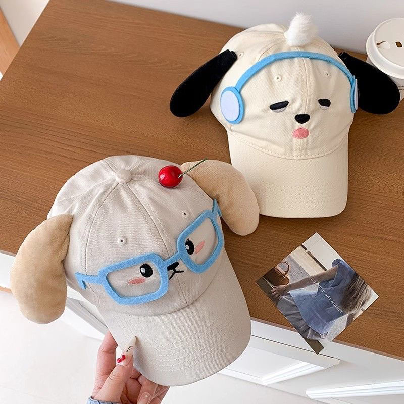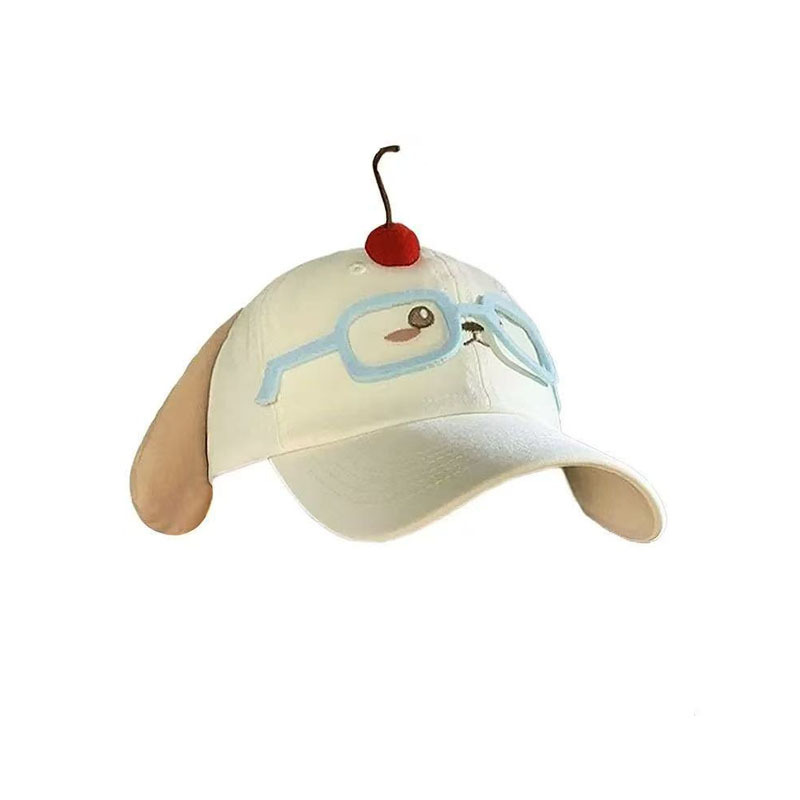 新款日系卡通可爱眼镜樱桃小狗棒球帽甜美呆萌耳机小狗鸭舌帽