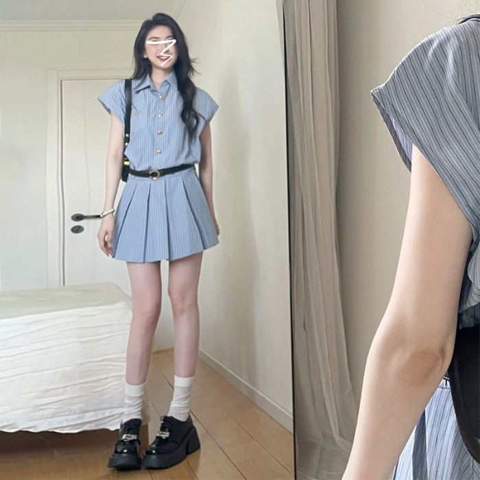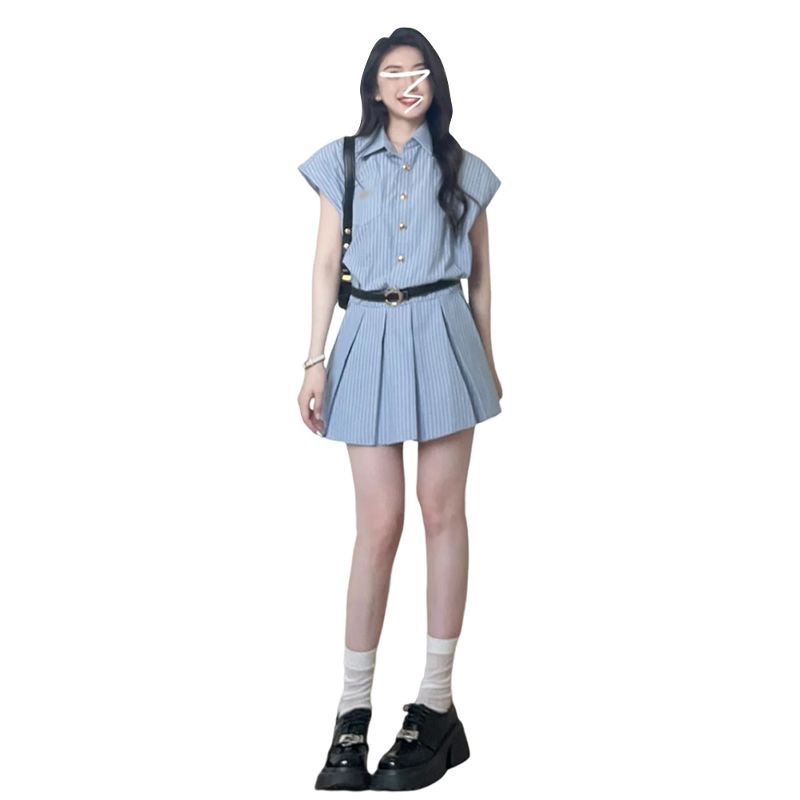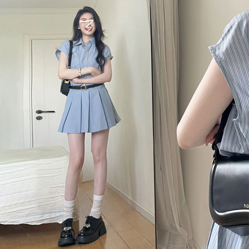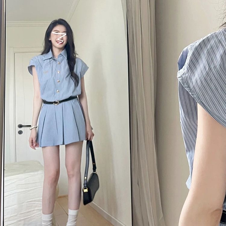 学院风蓝色条纹衬衫连衣裙子女收腰显瘦气质设计感小众百褶短裙夏