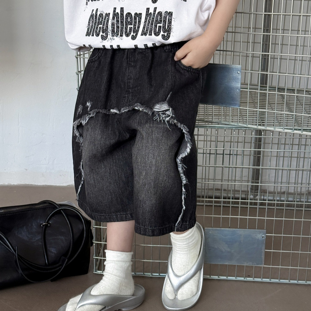 美式潮牌嘻哈牛仔短裤男童夏季高街毛边设计感宽松直筒阔腿五分裤