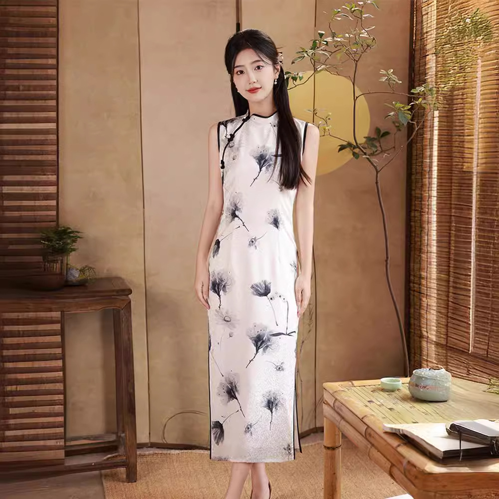 新款复古国潮印花改良旗袍新中式日常收腰中长款连衣裙