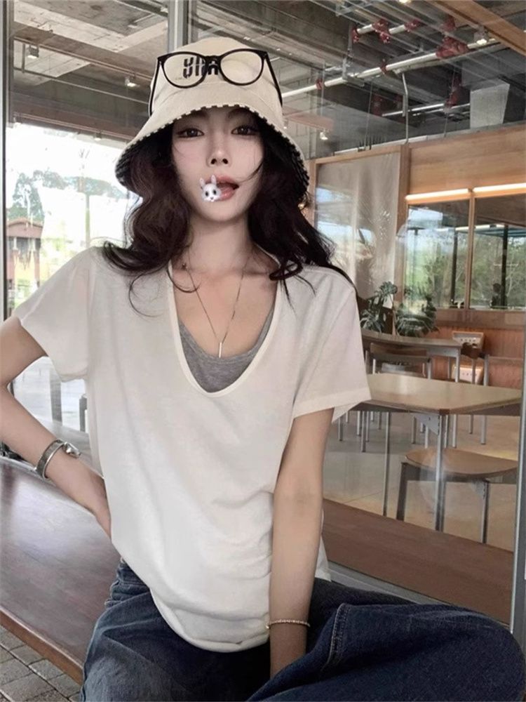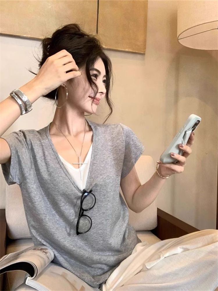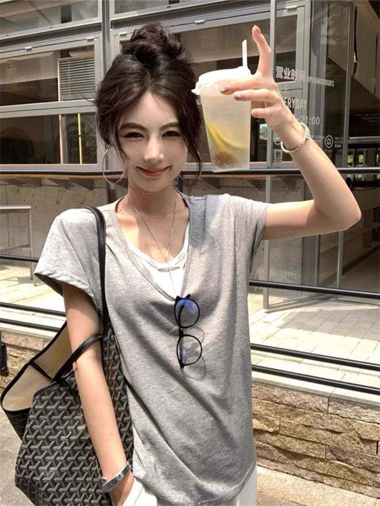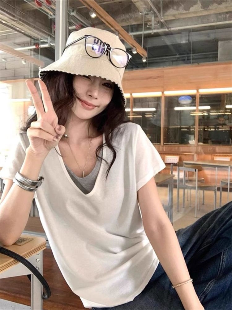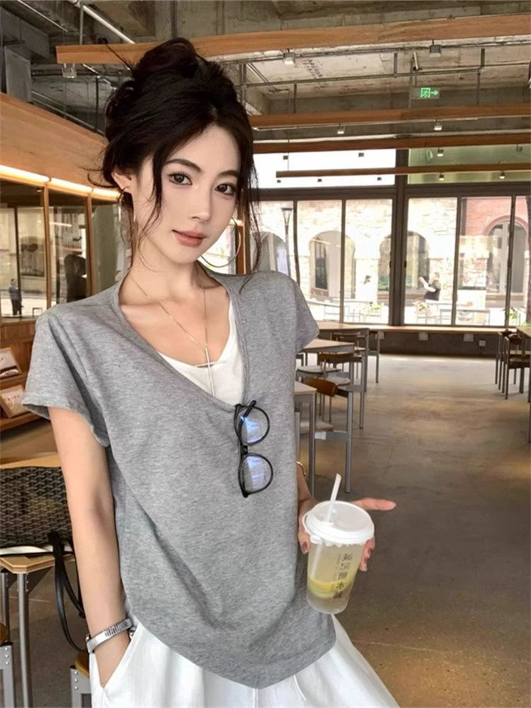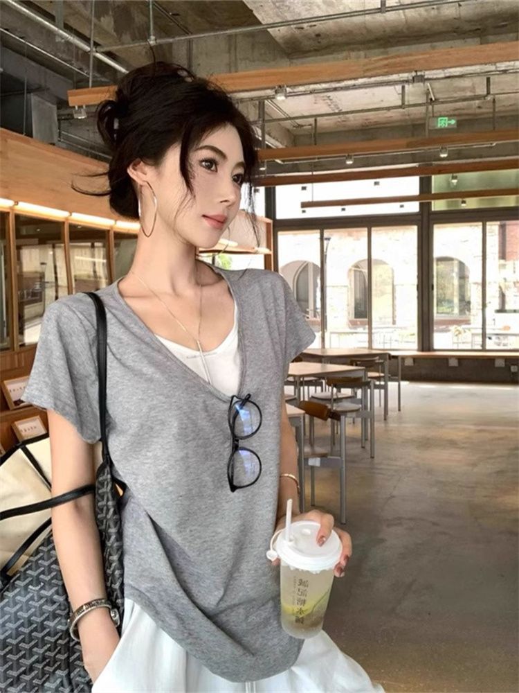 甜美风V领拼接撞色假两件T恤女夏季休闲宽松短袖百搭上衣