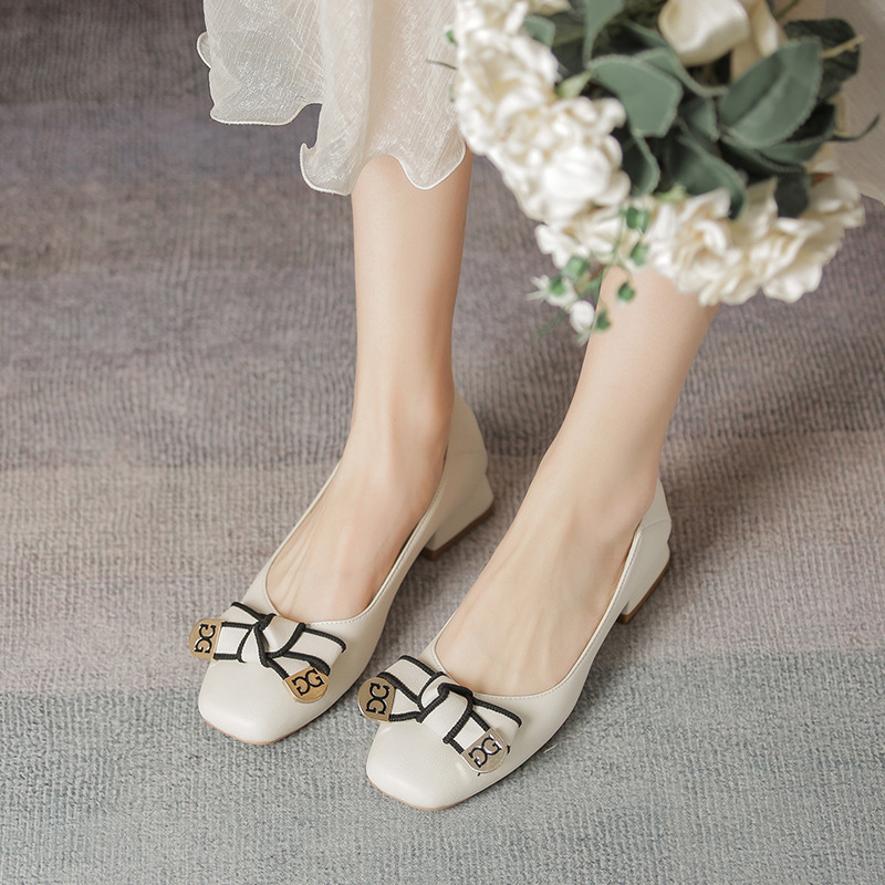 气质温柔单鞋法式米白浅口方头单鞋女新款粗跟仙女风蝴蝶结