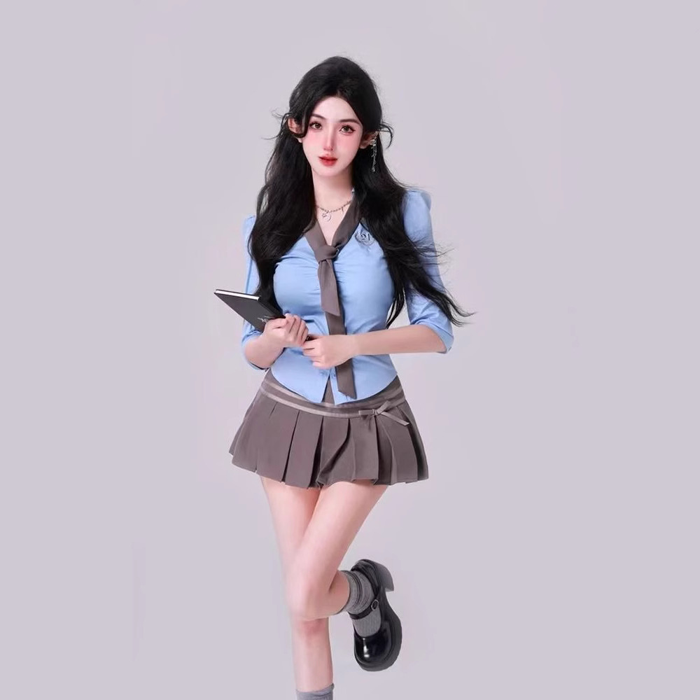 jk制服套装女夏款纯欲学院风蓝色衬衫上衣收腰显瘦百褶裙子两件套