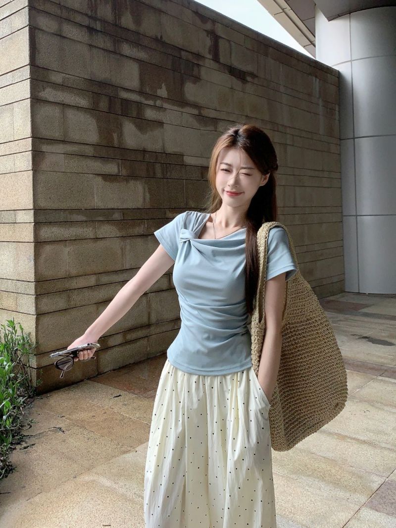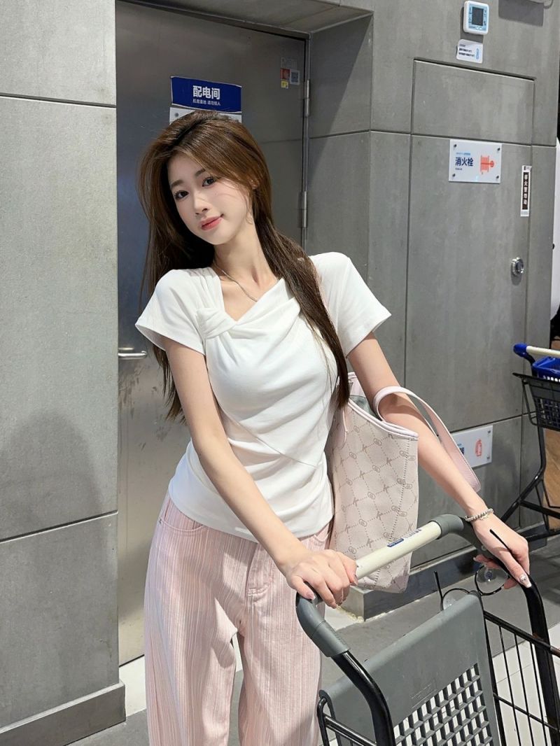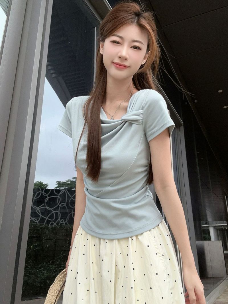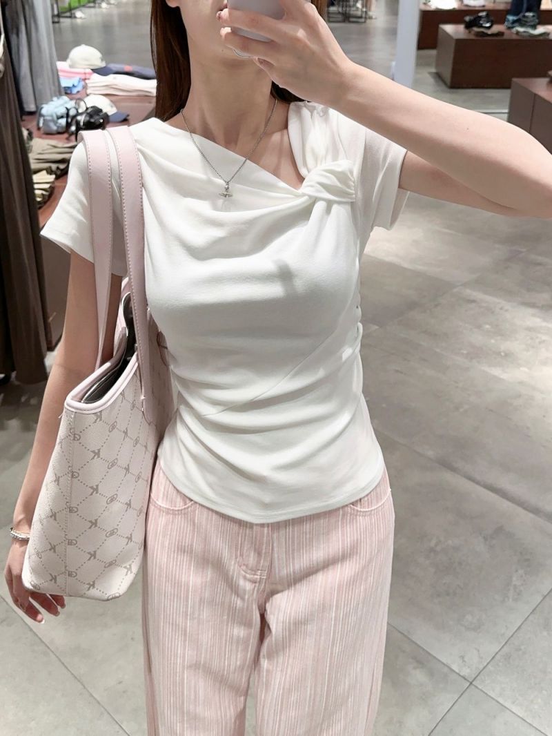 不规则扭结设计感短袖T恤女夏新款宽松修身显瘦百搭纯色上衣