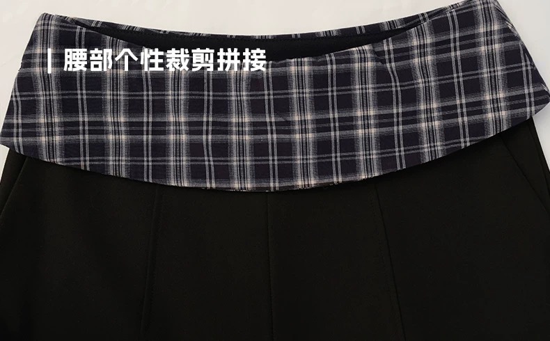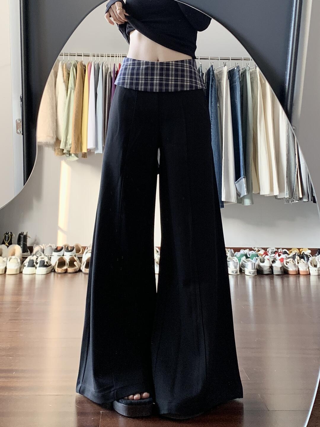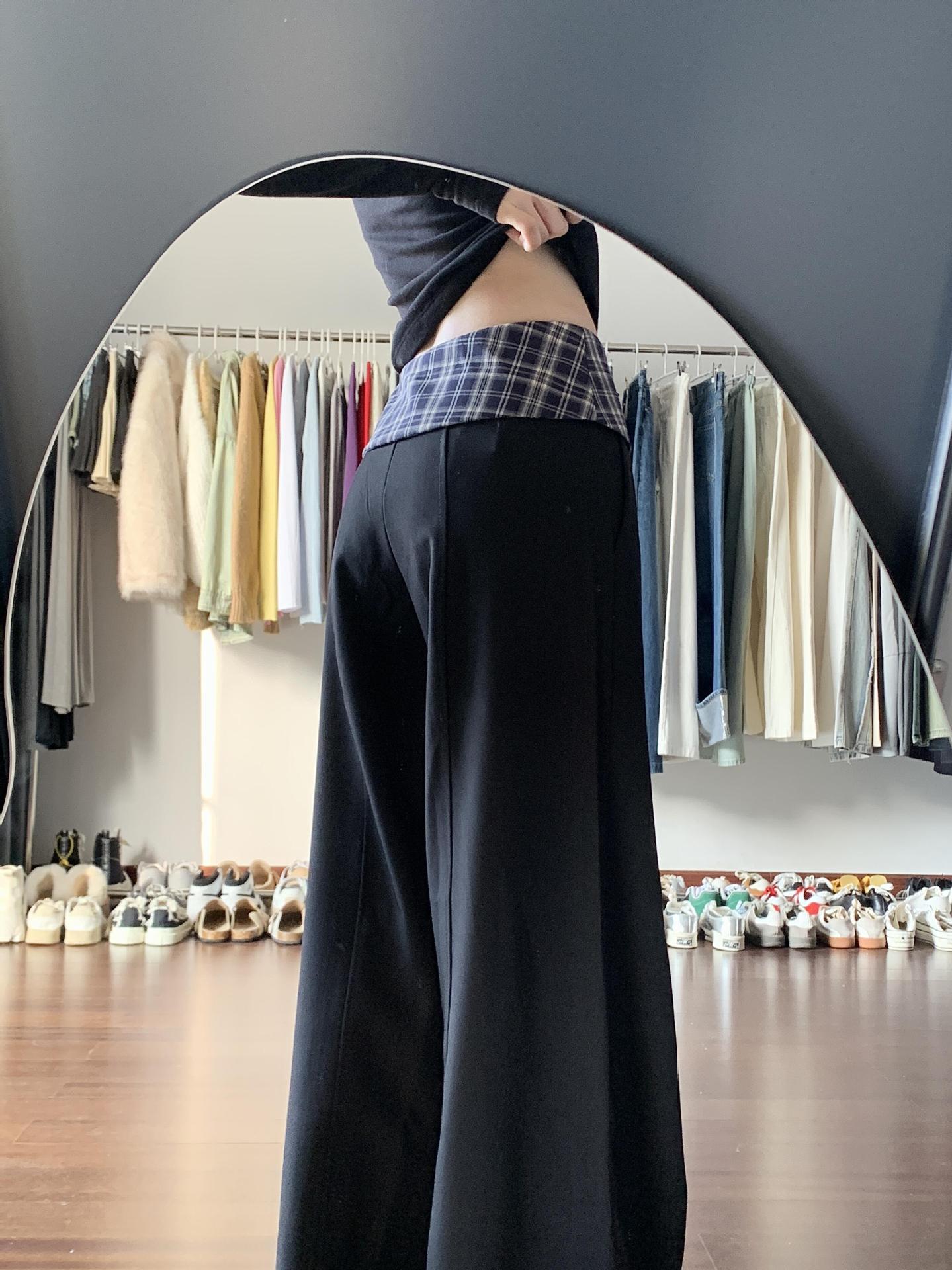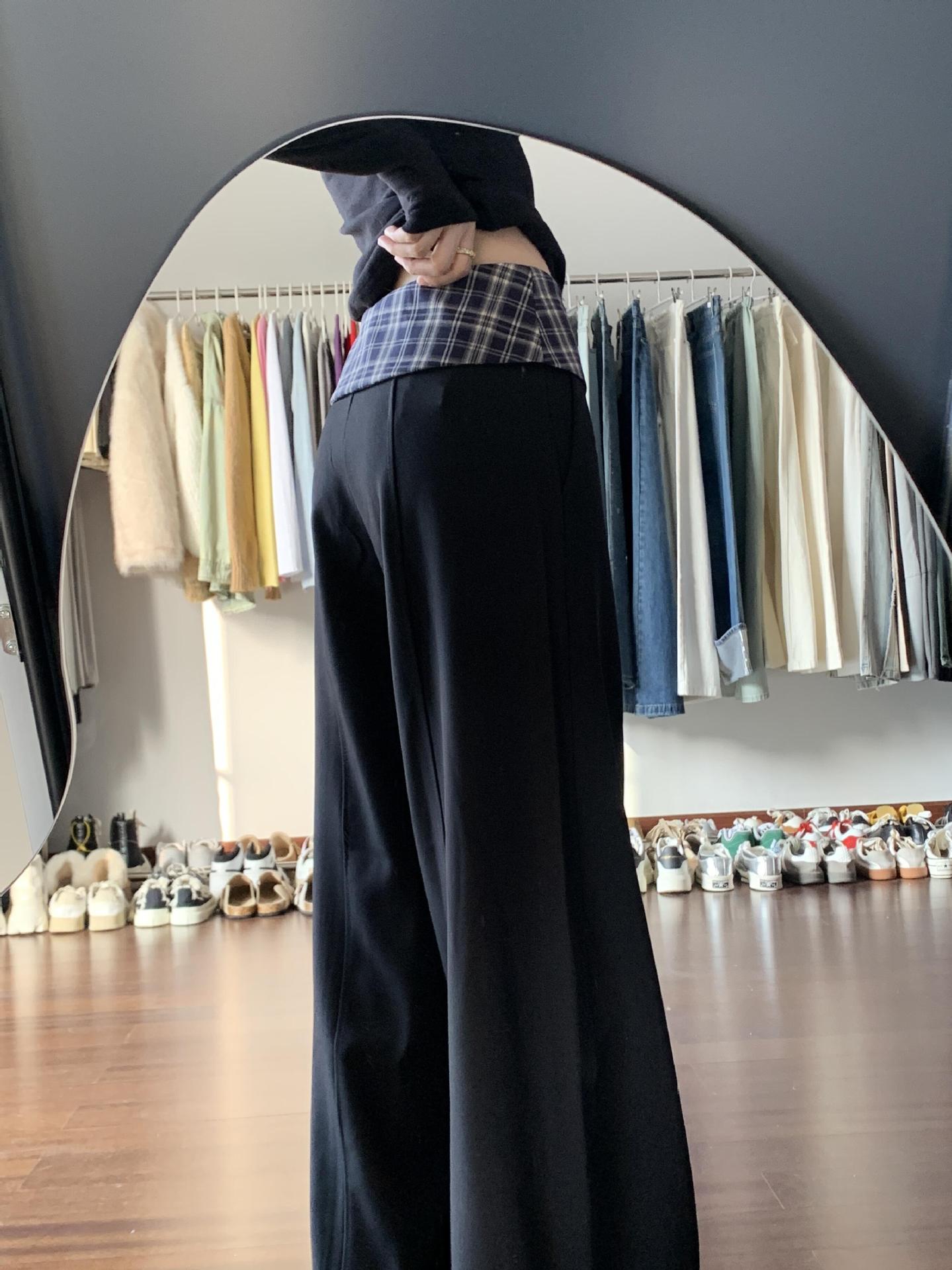 黑色格子拼接西装阔腿裤女2025新款设计感高腰显瘦宽松垂感休闲裤