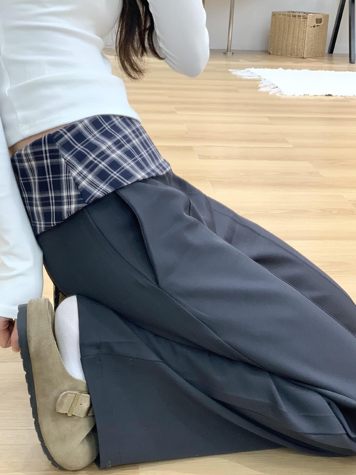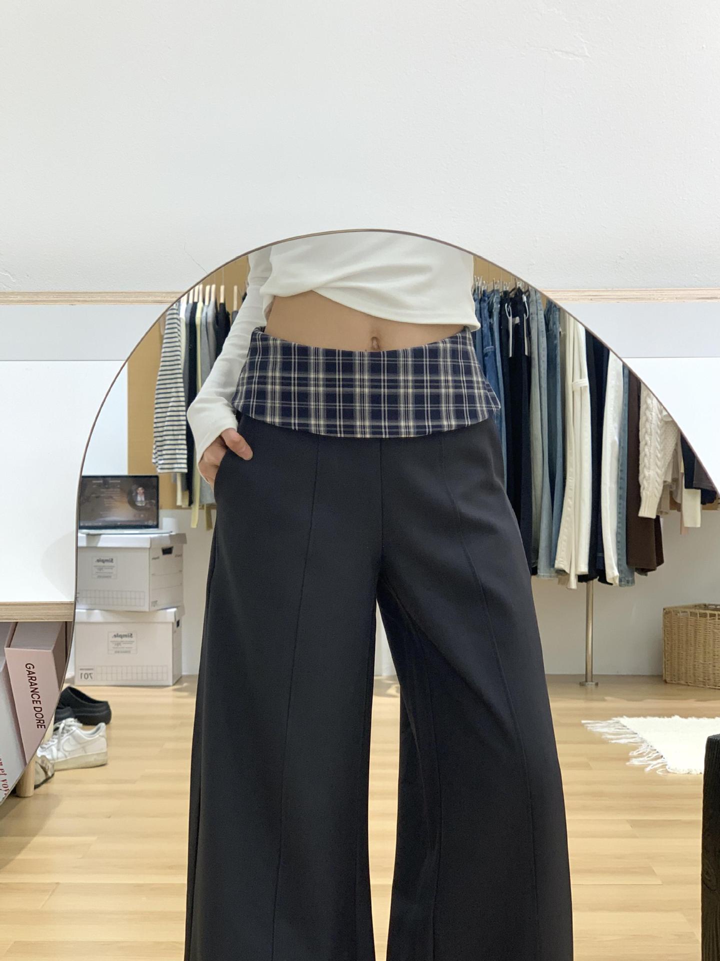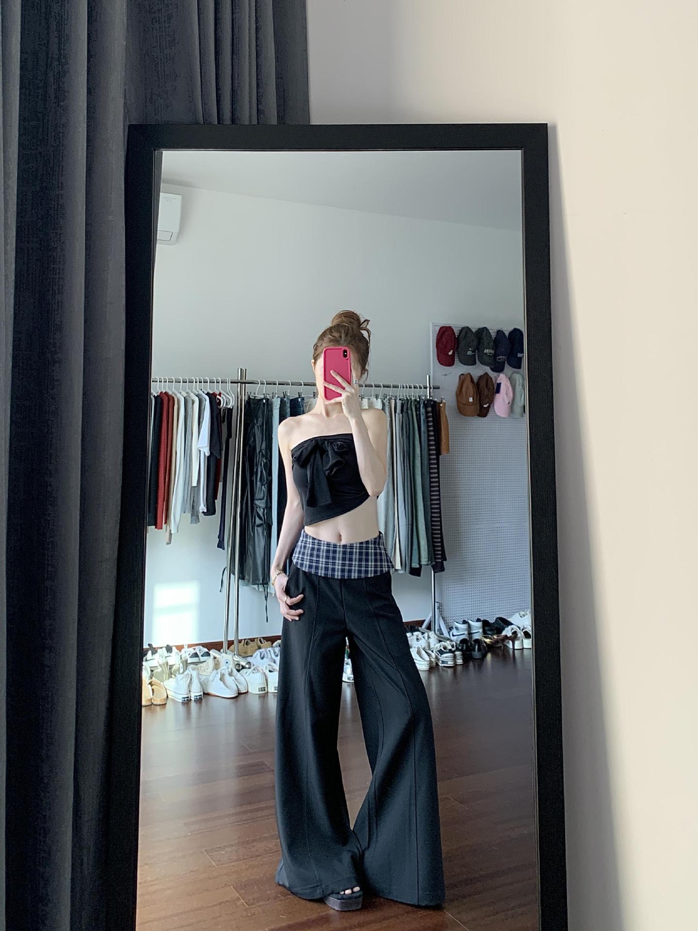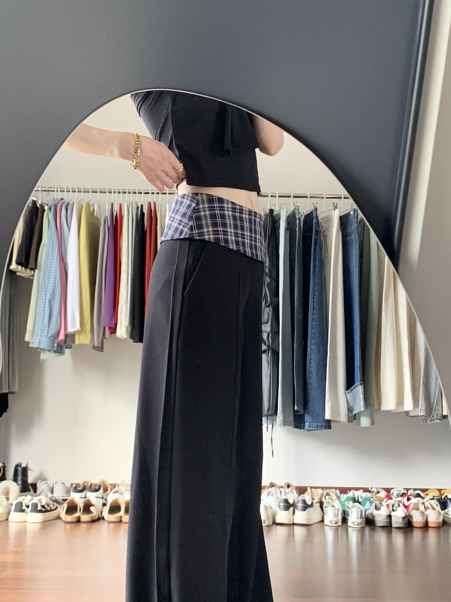 黑色格子拼接西装阔腿裤女2025新款设计感高腰显瘦宽松垂感休闲裤