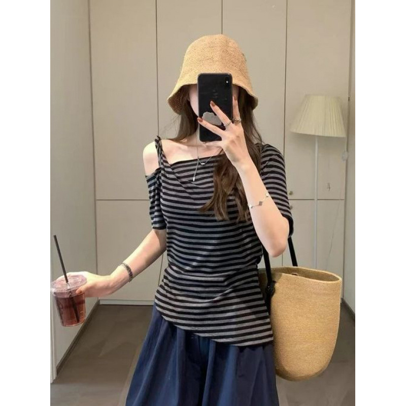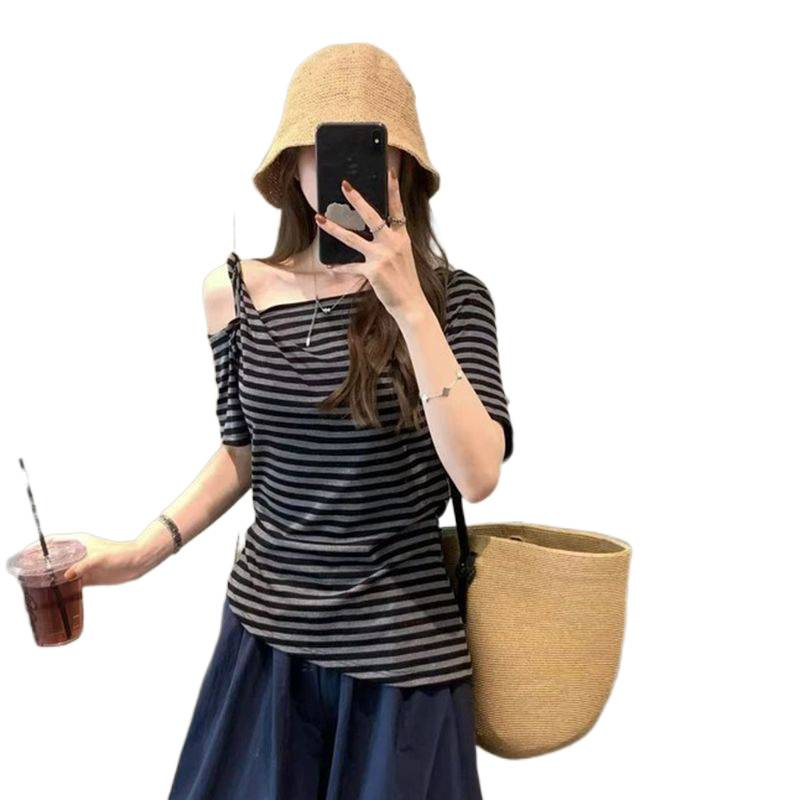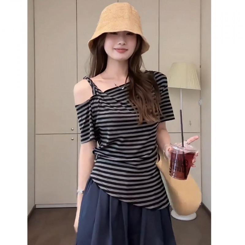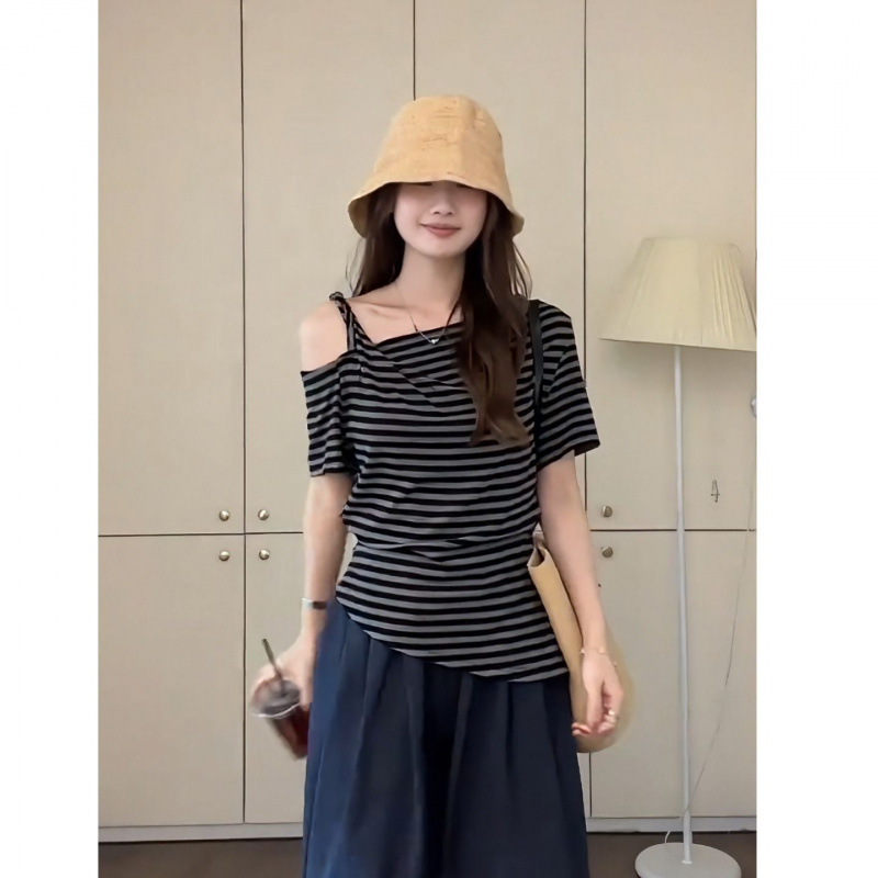 韩系条纹吊带斜肩短袖T恤女夏季性感掐腰不规则修身显瘦辣妹上衣