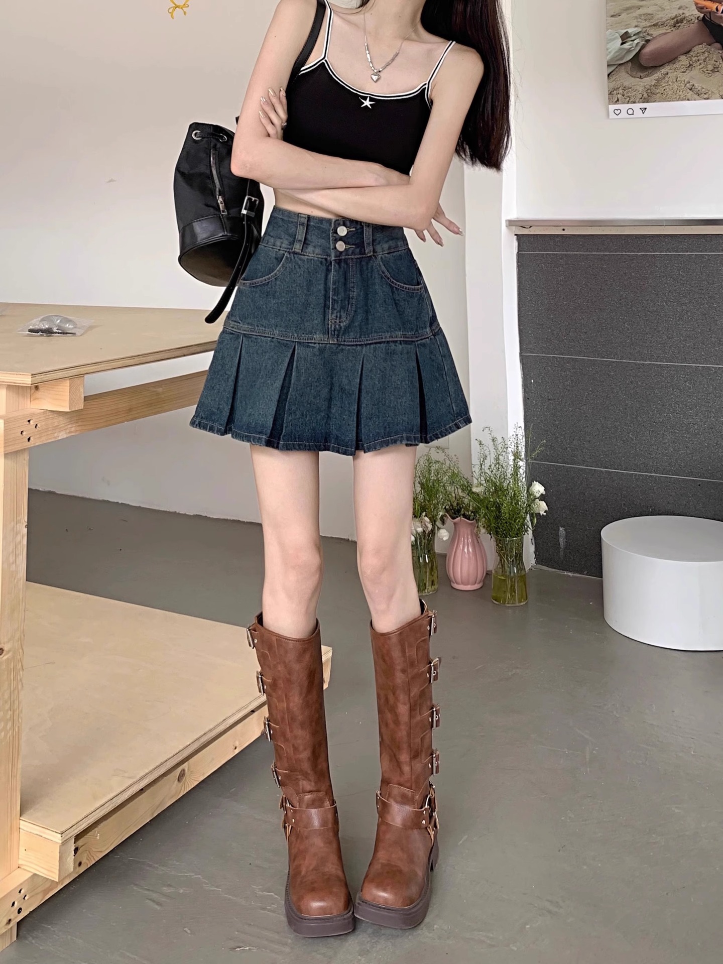 韩版高腰百褶牛仔半身裙女夏季遮肚显瘦设计感小众a字短裙子