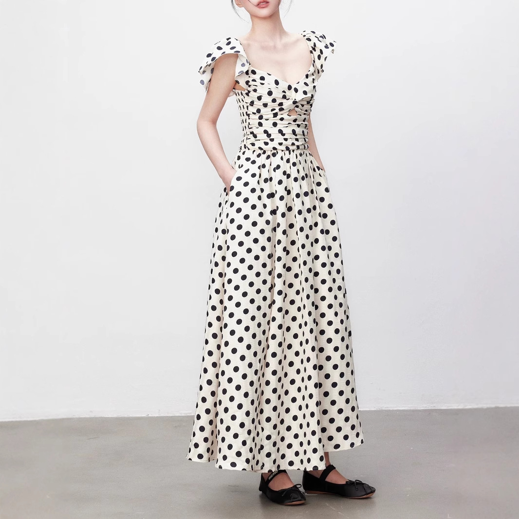 高级感波点连衣裙夏季新款褶皱收腰显瘦气质长款裙子