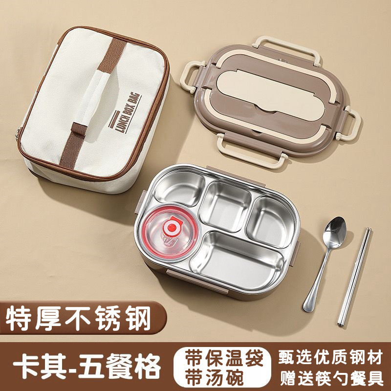 - 食品级内胆-卡其色【五格+餐具+汤碗+保温袋】