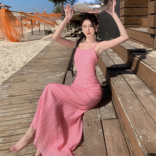 高级感海边多巴胺露背连衣裙粉色沙滩裙吊带海岛长裙大理度假穿搭