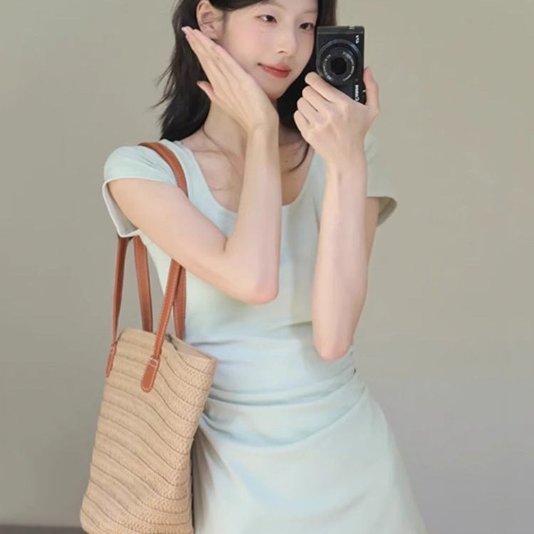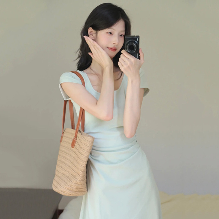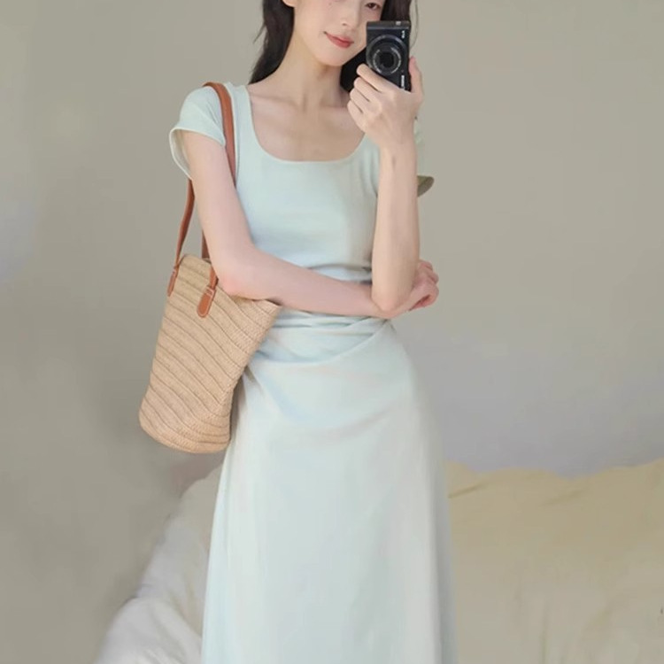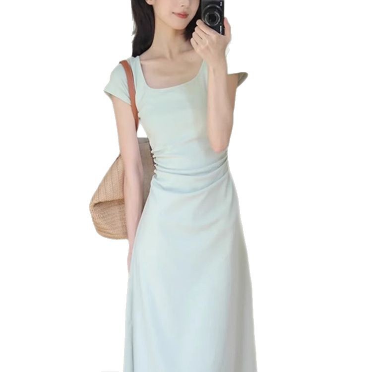 2025夏季新款清新感修身显瘦气质长裙豆绿色法式方领收腰连衣裙女