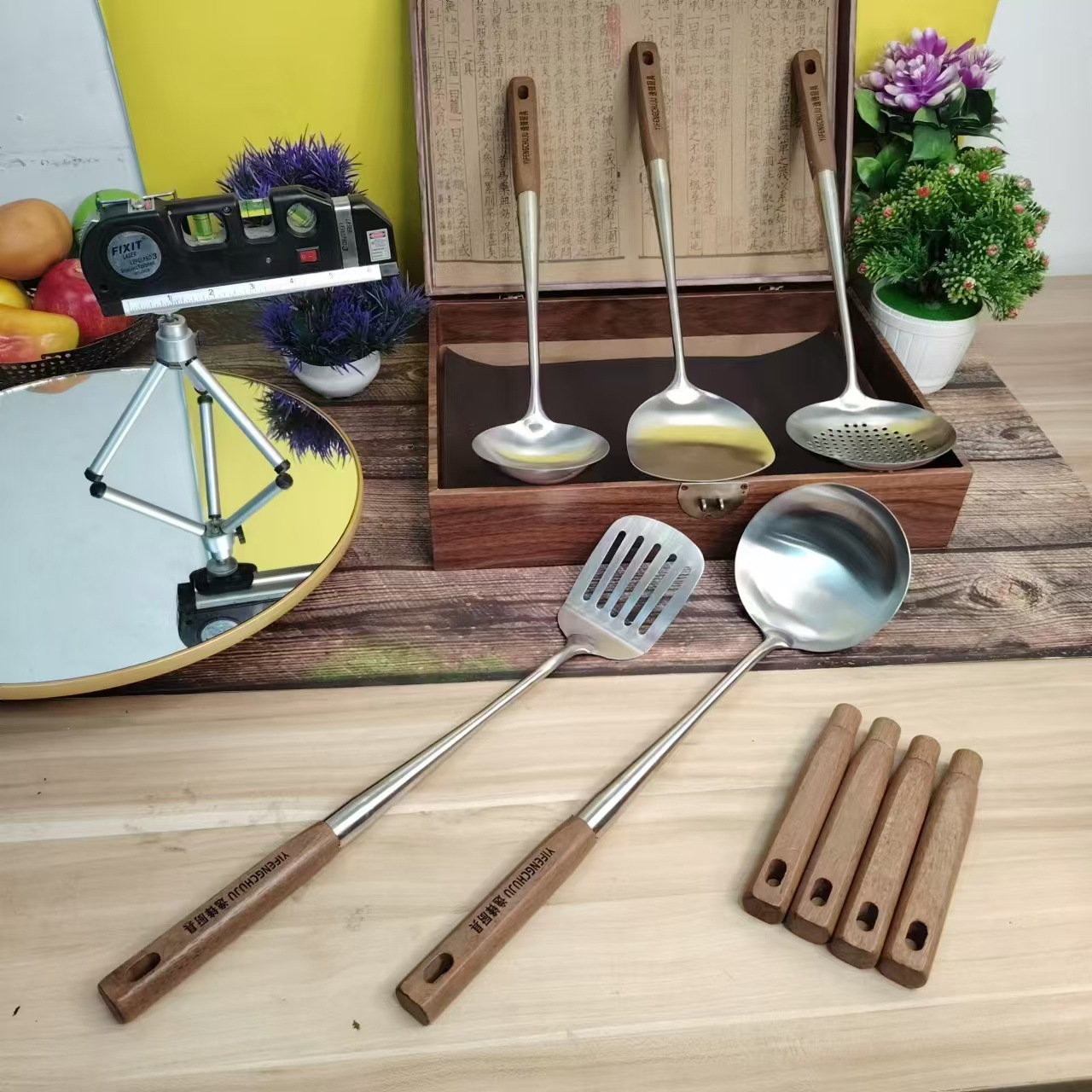 仿胡桃实木不锈钢烹饪勺铲加长柄锅铲汤勺漏勺煎铲厨具套装