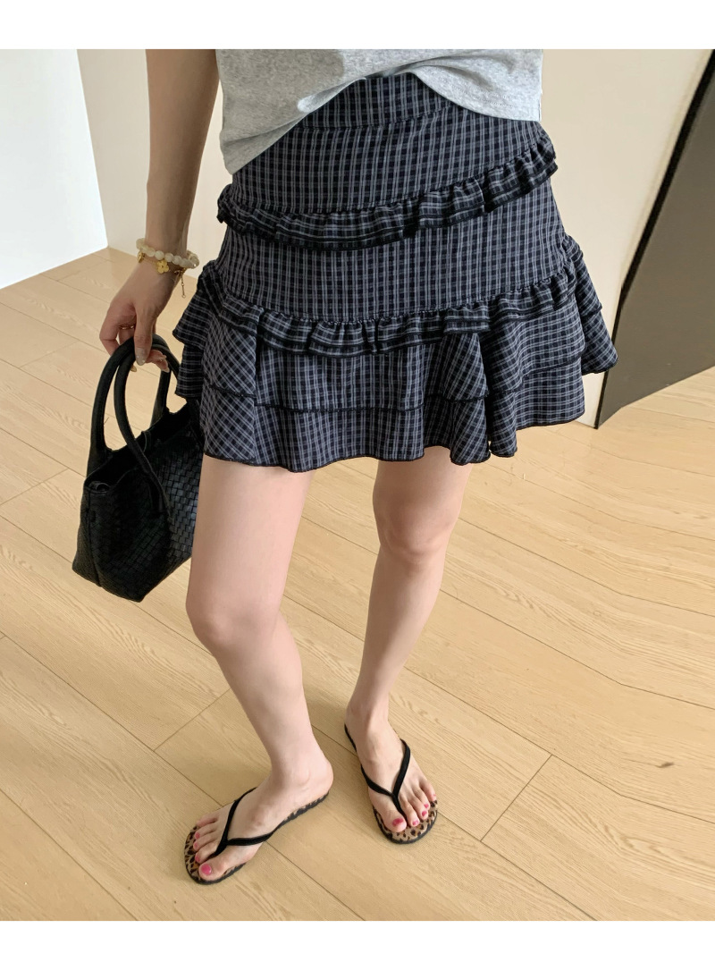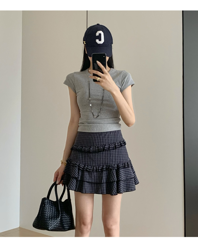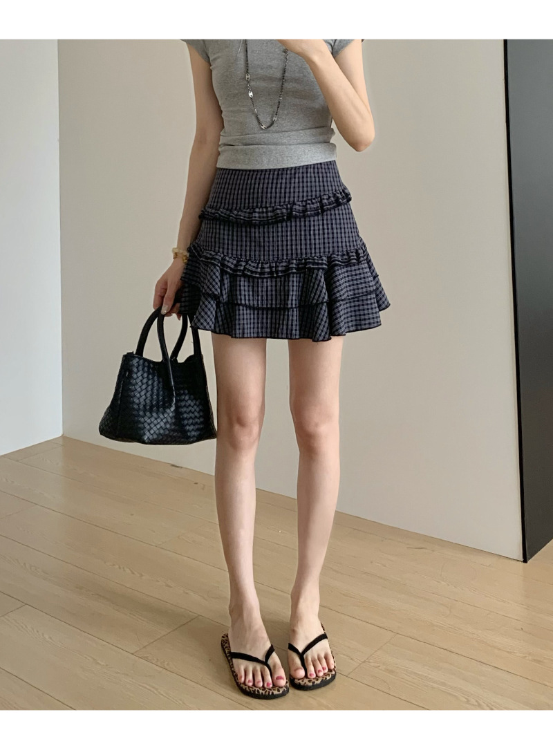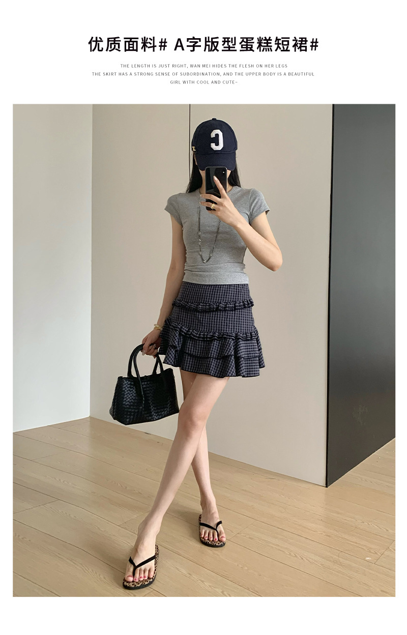 设计感格纹花边蛋糕短裙女夏季小众高腰百搭A字裙遮胯显瘦半身裙