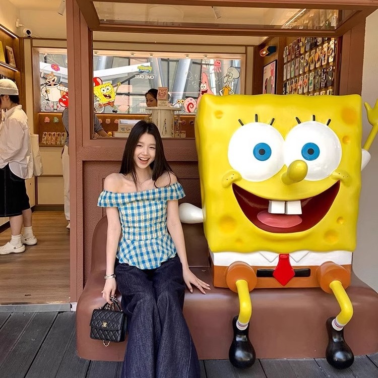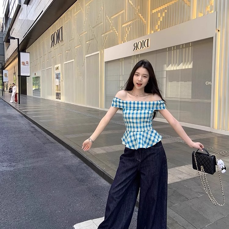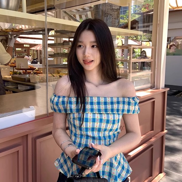 蓝色格纹一字领衬衫女2025夏季新款荷叶边露肩上衣