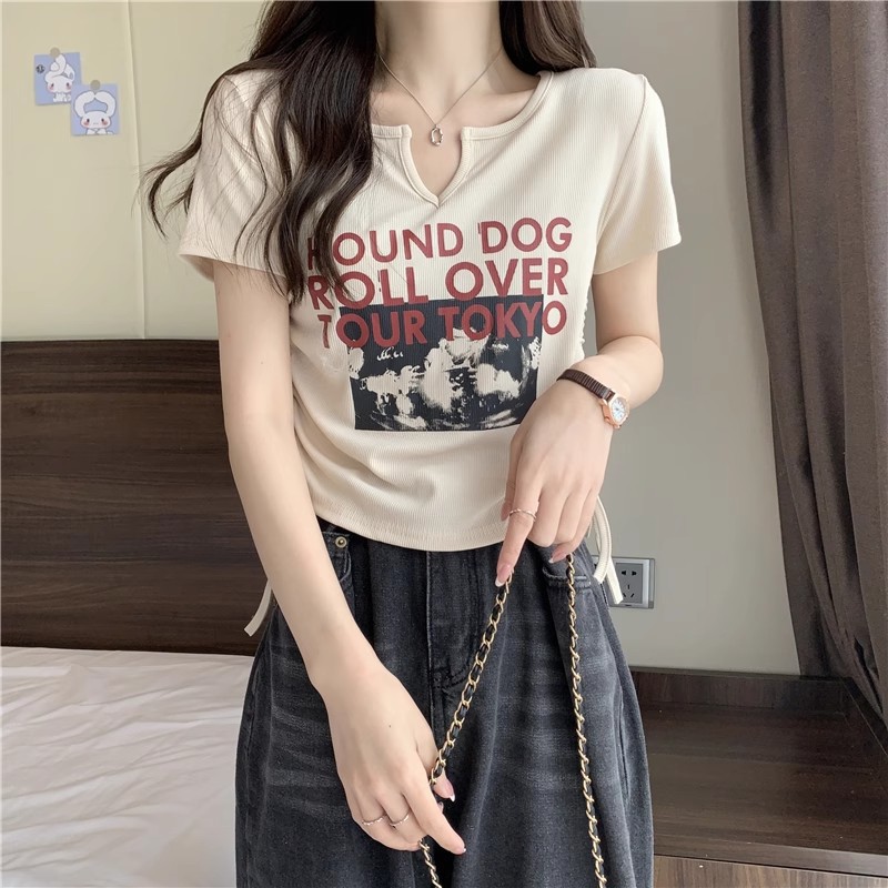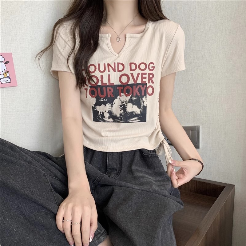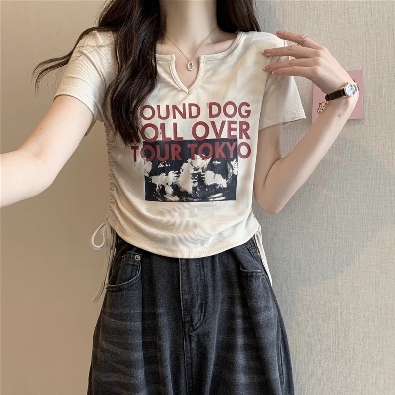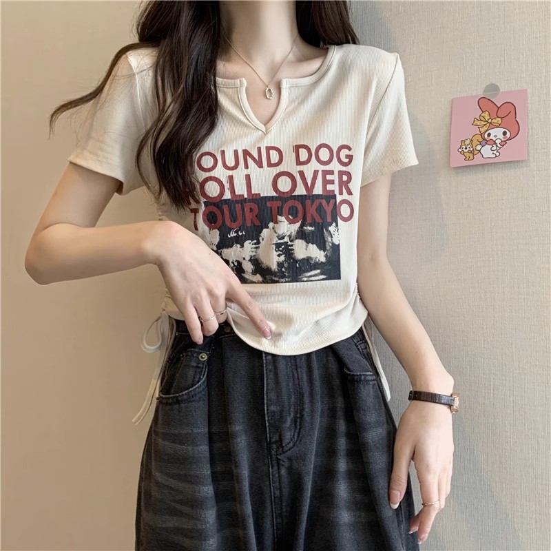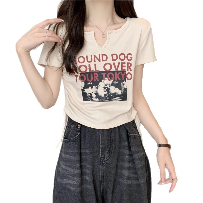夏季2025年新款韩版短款v领字母印花抽绳打底衫女装短袖T恤上衣潮