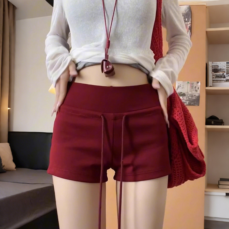 红色辣妹运动短裤女夏季2025新款小个子抽绳瑜伽包臀显瘦低腰热裤
