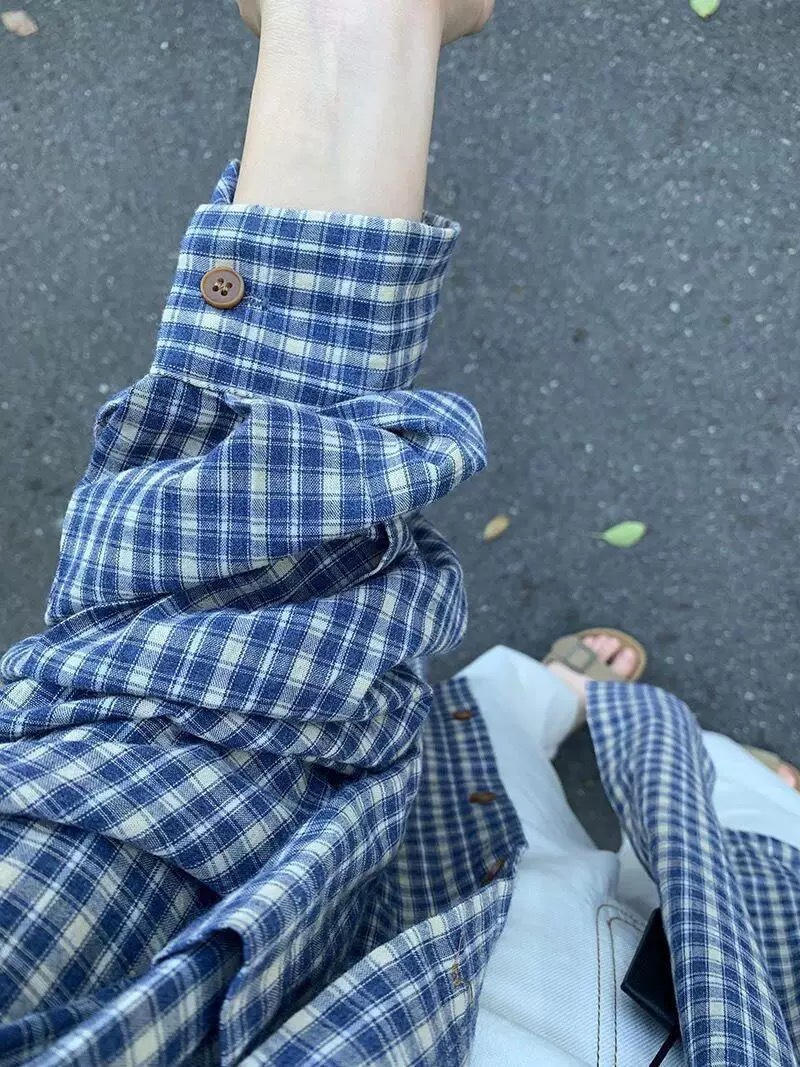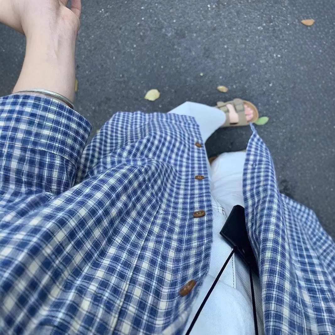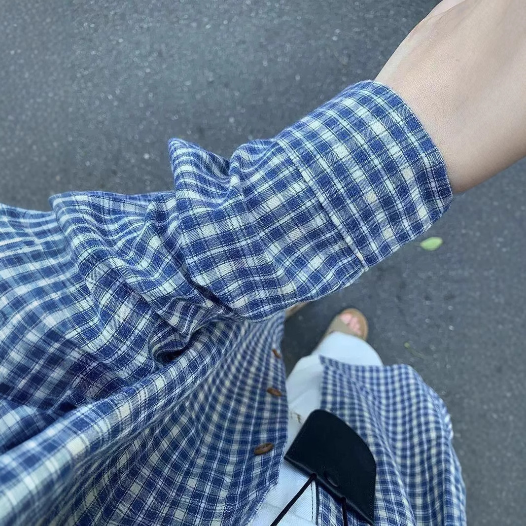 蓝色格子条纹长袖衬衫2025新款春秋衬衣小个子外搭法式复古外套