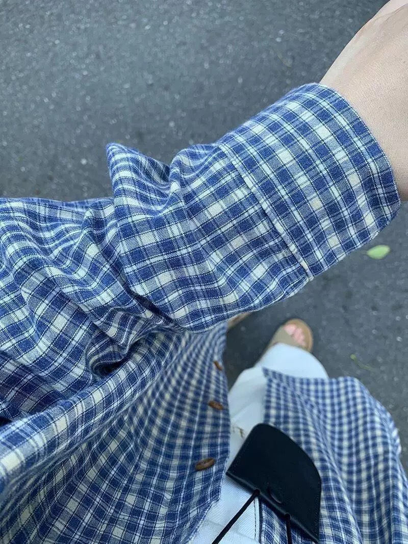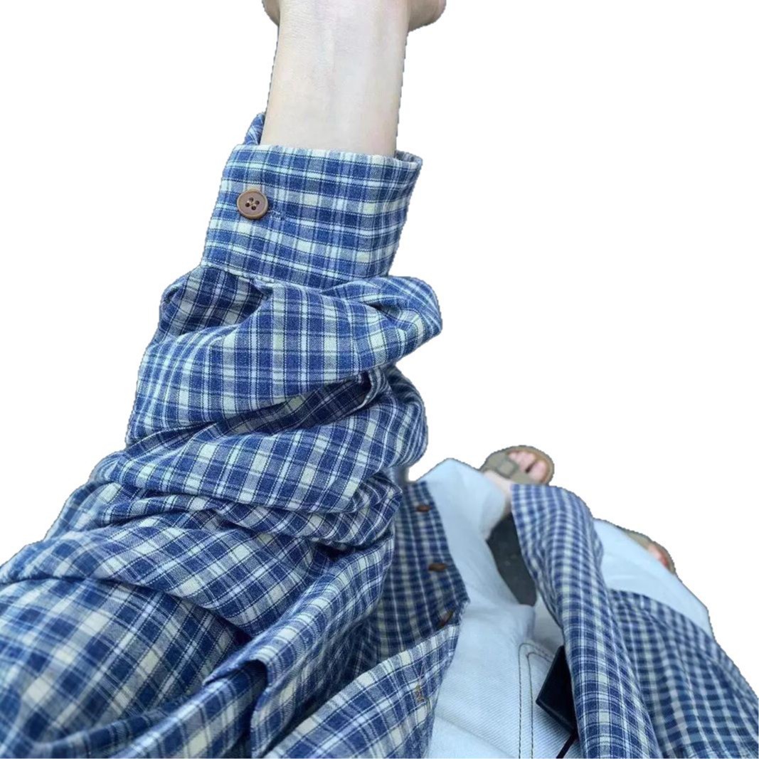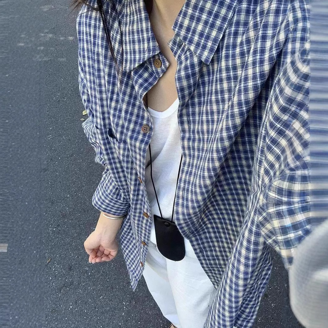 蓝色格子条纹长袖衬衫2025新款春秋衬衣小个子外搭法式复古外套